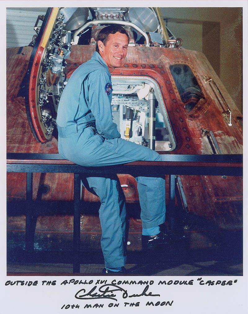 Color satin-finish 8 x 10 photo of Duke posing outside the Apollo 16 command module, signed in the lower border in black felt tip, “Outside the Apollo XVI Command Module ‘Casper,’ Charlie Duke, 10th Man on the Moon.” In very fine condition.