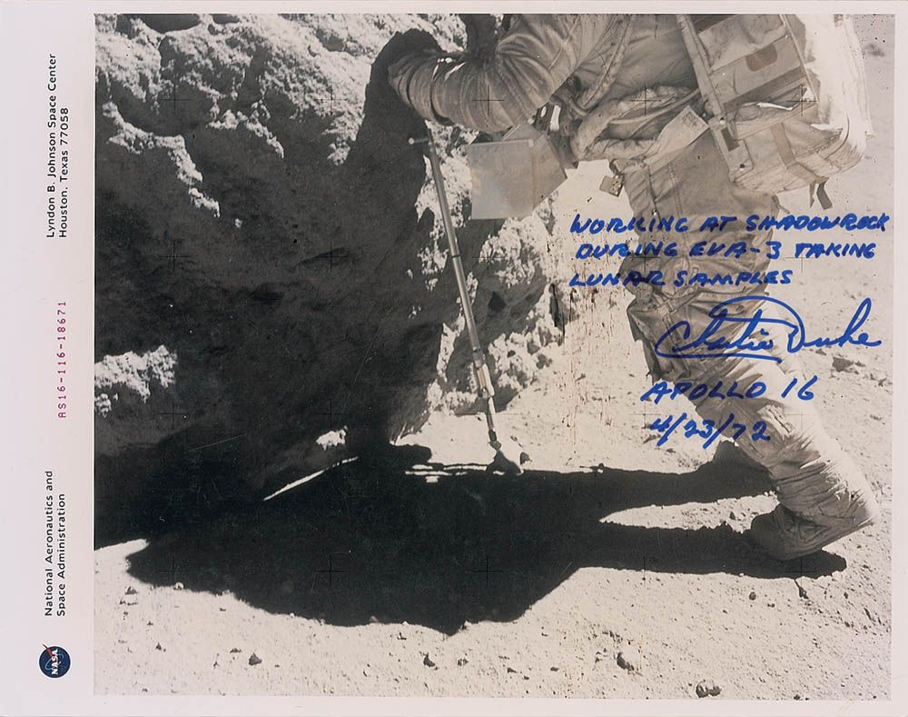 Color satin-finish 10 x 8 ‘red-numbered’ NASA photo of Duke working at ‘Shadowrock’ during the Apollo 16 mission, signed in blue felt tip, “Working at Shadowrock during EVA-3 taking lunar samples. Charlie Duke, Apollo 16, 4/23/72.” In fine condition.