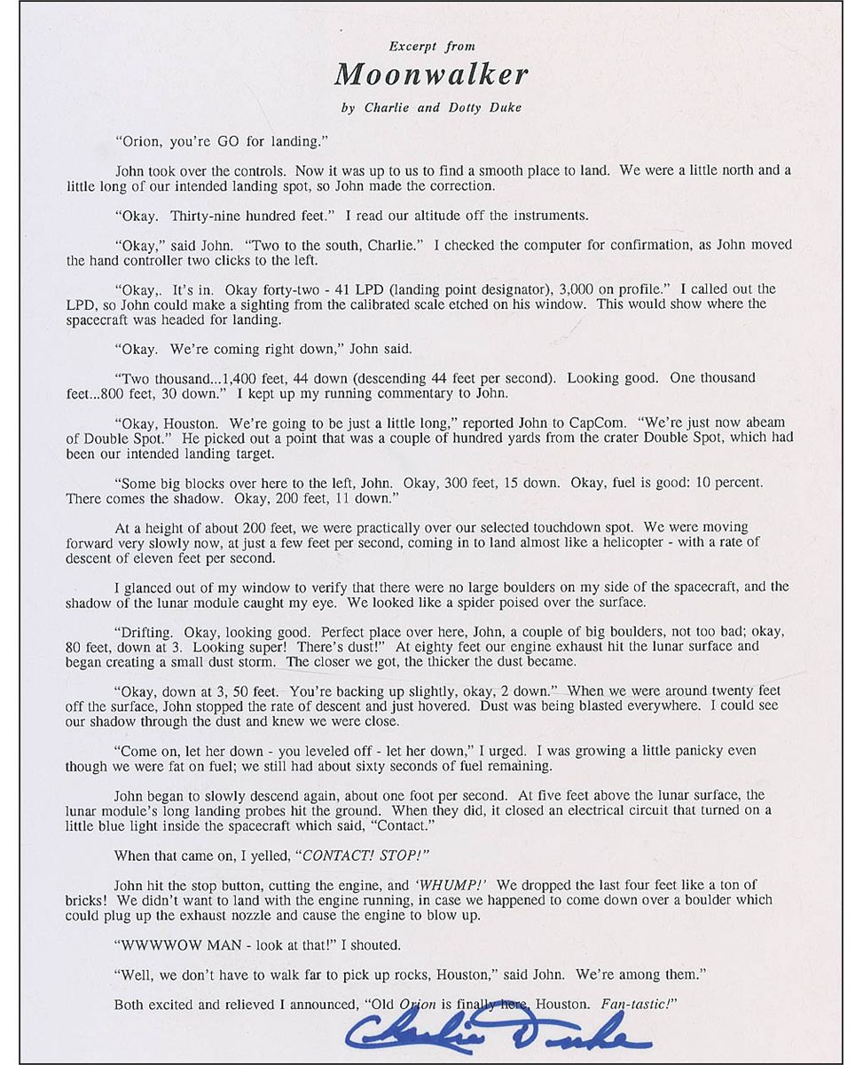 Souvenir typescript, one page, 8.5 x 11, an excerpt from Moonwalker, signed at the bottom in blue felt tip. In fine condition.
