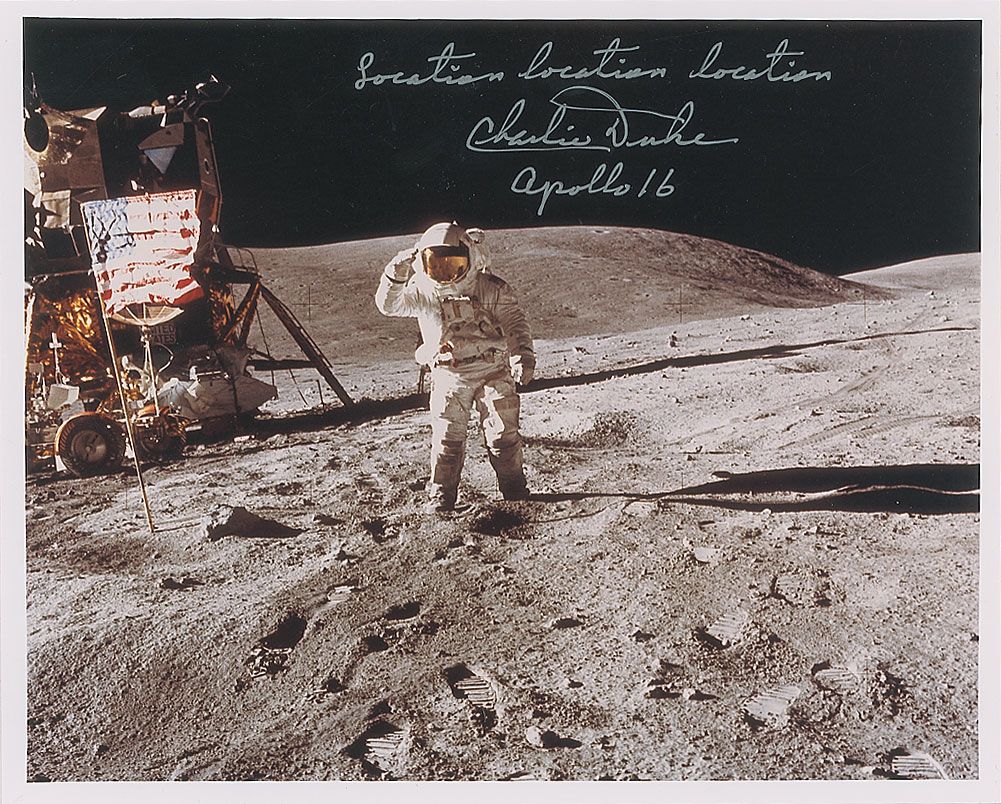 Color satin-finish 10 x 8 photo of Duke saluting the American flag on the lunar surface, signed in silver ink, “Location, location, location. Charlie Duke, Apollo 16.” In very fine condition.