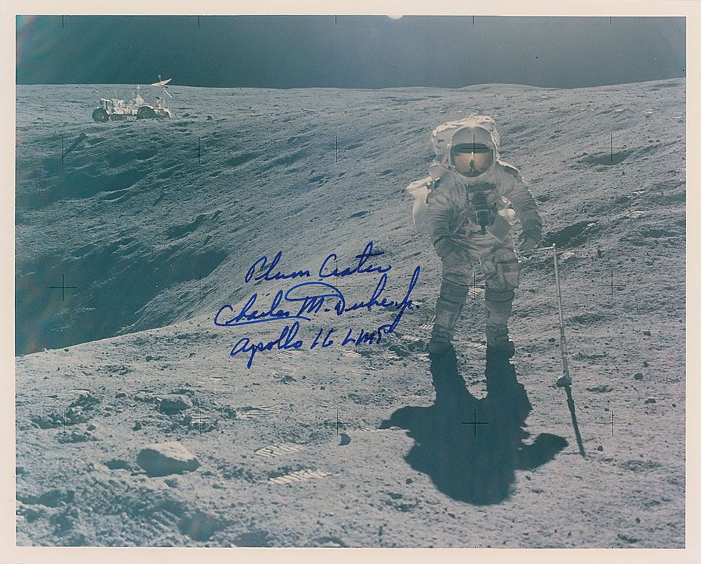 Color satin-finish 10 x 8 photo of Duke walking along the rim of Plum Crater, signed in blue felt tip, “Plum Crater, Charles M. Duke, Jr., Apollo 16 LMP.” In very fine condition.