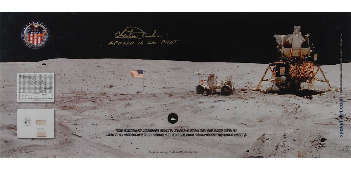 Limited edition presentation of a small triangular swatch of moondust-soiled Velcro, affixed to a color satin-finish 22.5 x 9.25 photo of the Apollo 16 LM and rover on the moon’s surface, with information printed along the bottom reading, “This swatch of moondust stained Velcro is from the ‘cue card’ used by Apollo 16 astronauts John Young and Charles Duke to navigate the lunar module.” Signed in gold ink, “Charlie Duke, Apollo 16 LMP.” Rolled and in fine condition. Accompanied by a copy of a Letter of Certification by Duke for the flown cue card, as well as two certificates of authenticity from Florian Noller.