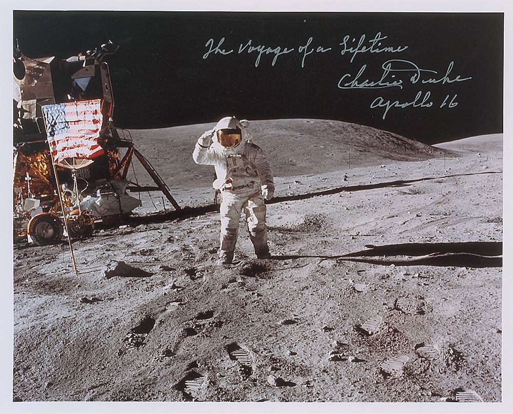 Color satin-finish 10 x 8 photo of Duke saluting the flag on the lunar surface, signed in silver ink, “The voyage of a lifetime, Charlie Duke, Apollo 16.” In very fine condition.