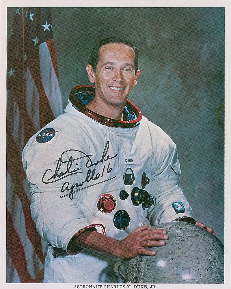 Color 8 x 10 NASA photo of Duke in his white space suit, signed in black felt tip, “Charlie Duke, Apollo 16.” In fine condition.