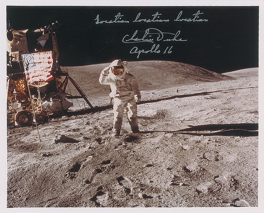 Color satin-finish 10 x 8 photo of Duke saluting the flag on the lunar surface, signed in silver ink, “Location, location, location, Charlie Duke, Apollo 16.” In very fine condition.