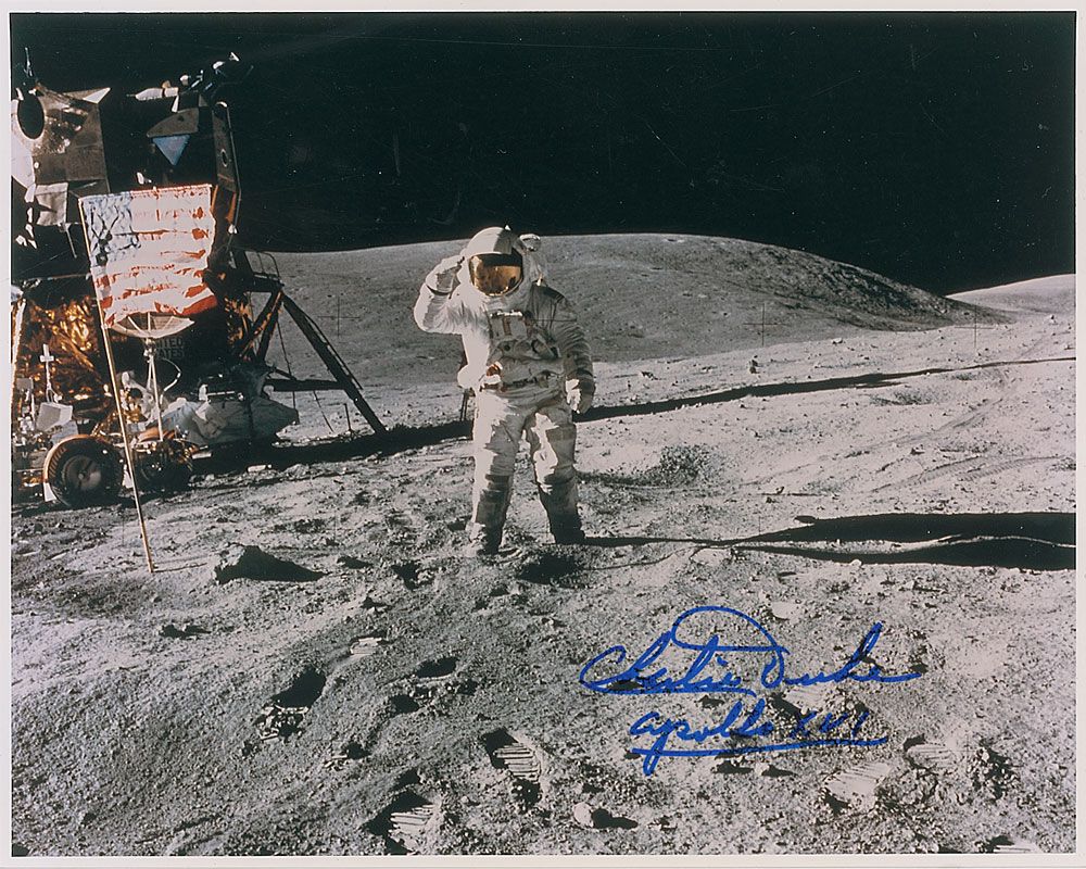 Color satin-finish 10 x 8 photo of Duke saluting the flag on the lunar surface, signed in blue felt tip, “Charlie Duke, Apollo XVI.” In very fine condition.