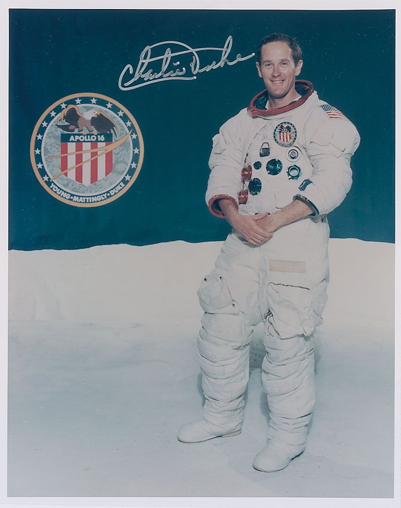 Color satin-finish 8 x 10 full-length photo of Duke in his white space suit alongside an Apollo 16 mission emblem, signed in silver ink. In very fine condition.