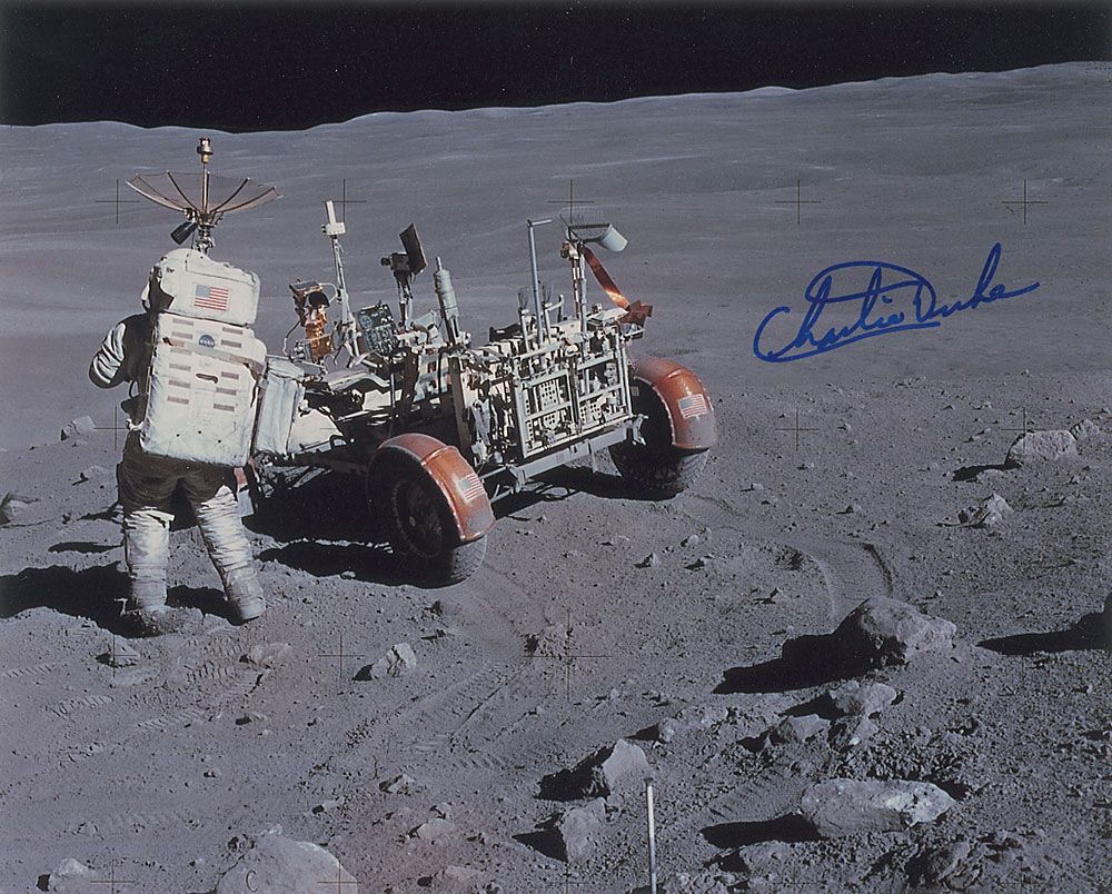Color satin-finish 10 x 8 photo of Duke working near the lunar rover on the moon’s surface, signed in blue felt tip. In very fine condition.
