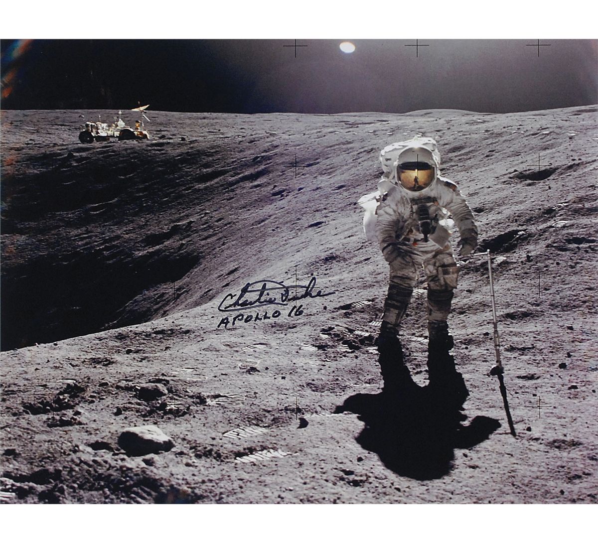 Color satin-finish 15 x 11.75 photo of Duke standing at the rim of Plum crater on the moon, signed in black felt tip, “Charlie Duke, Apollo 16.” In very fine condition.