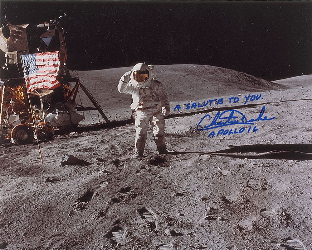 Color satin-finish 10 x 8 photo of Duke saluting the flag on the lunar surface, signed in blue felt tip, “A salute to you. Charlie Duke Apollo 16.” In fine condition.