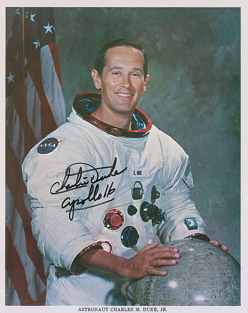 Color 8 x 10 NASA photo of Duke posing in his white space suit with a globe of the moon, signed in black felt tip, “Charlie Duke, Apollo 16.” In fine condition, with a couple trivial bends to background.