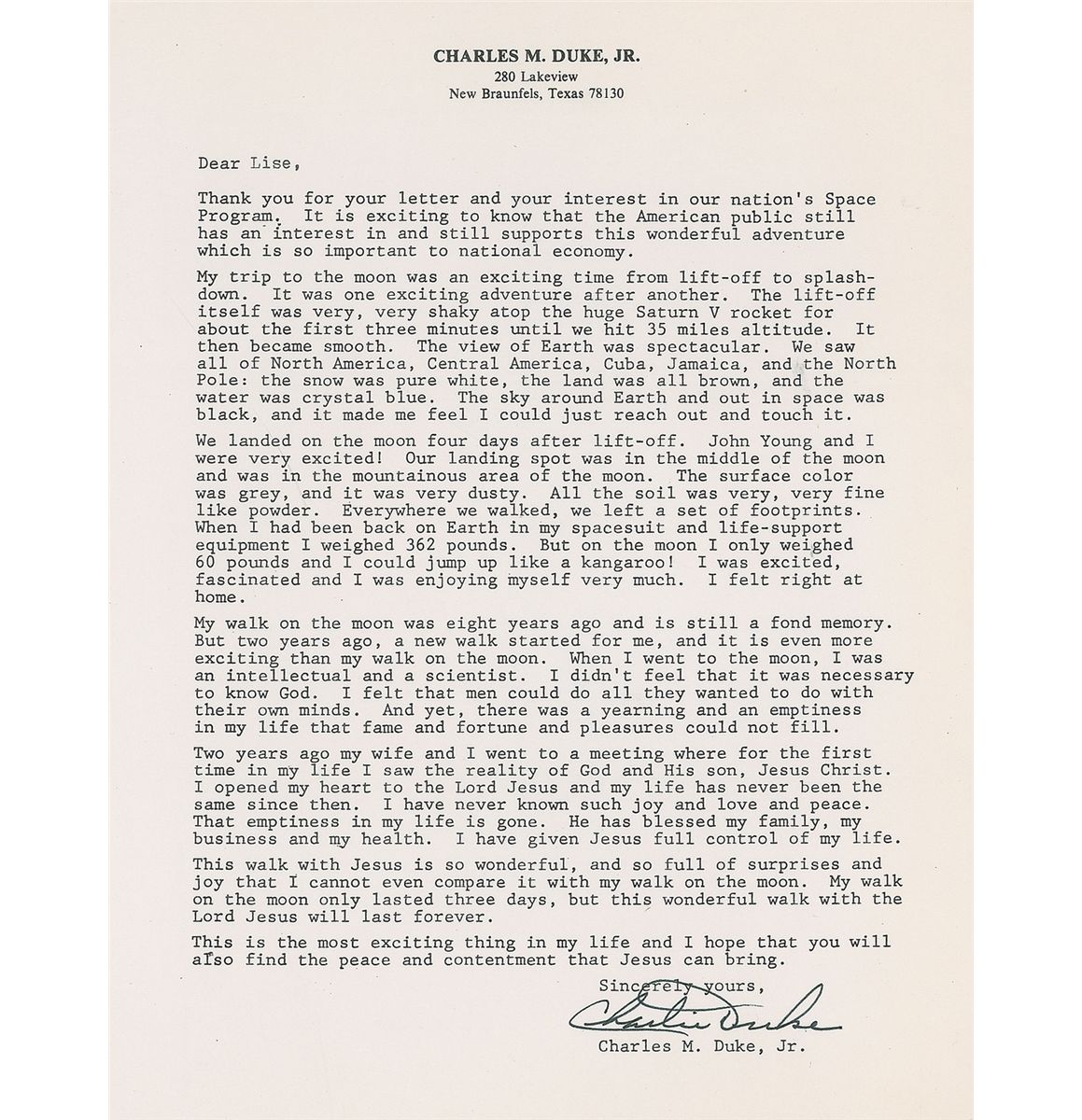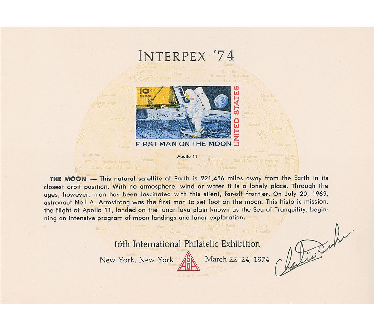 Signed form letter, one page, 8.5 x 11, personal letterhead, no date. Letter to an admirer. In part: “My trip to the moon was an exciting time from lift-off to splashdown. It was one exciting adventure after another. The lift-off itself was very, very shaky atop the huge Saturn V rocket for about the first three minutes…We landed on the moon four days after lift-off. John Young and I were very excited!…Everywhere we walked, we left a set of footprints. When I had been back on Earth in my spacesuit and life support equipment I weighed 362 pounds. But on the moon I only weighed 60 pounds and I could jump like a kangaroo! I was excited, fascinated and I was enjoying myself very much. I felt right at home. My walk on the moon was eight years ago and is still a fond memory for me.” In fine condition. Accompanied by a philatelic souvenir from Interpex ’74, 8 x 6, signed in black ink by Duke.