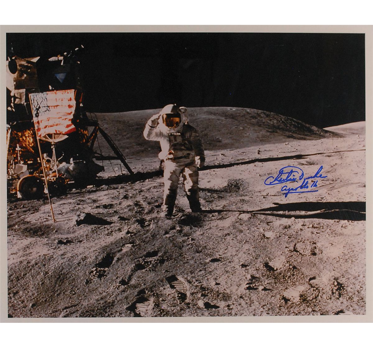 Color satin-finish 20 x 16 photo of Duke saluting the flag on the lunar surface, signed in blue felt tip, “Charlie Duke, Apollo 16.” Rolled and in fine condition.