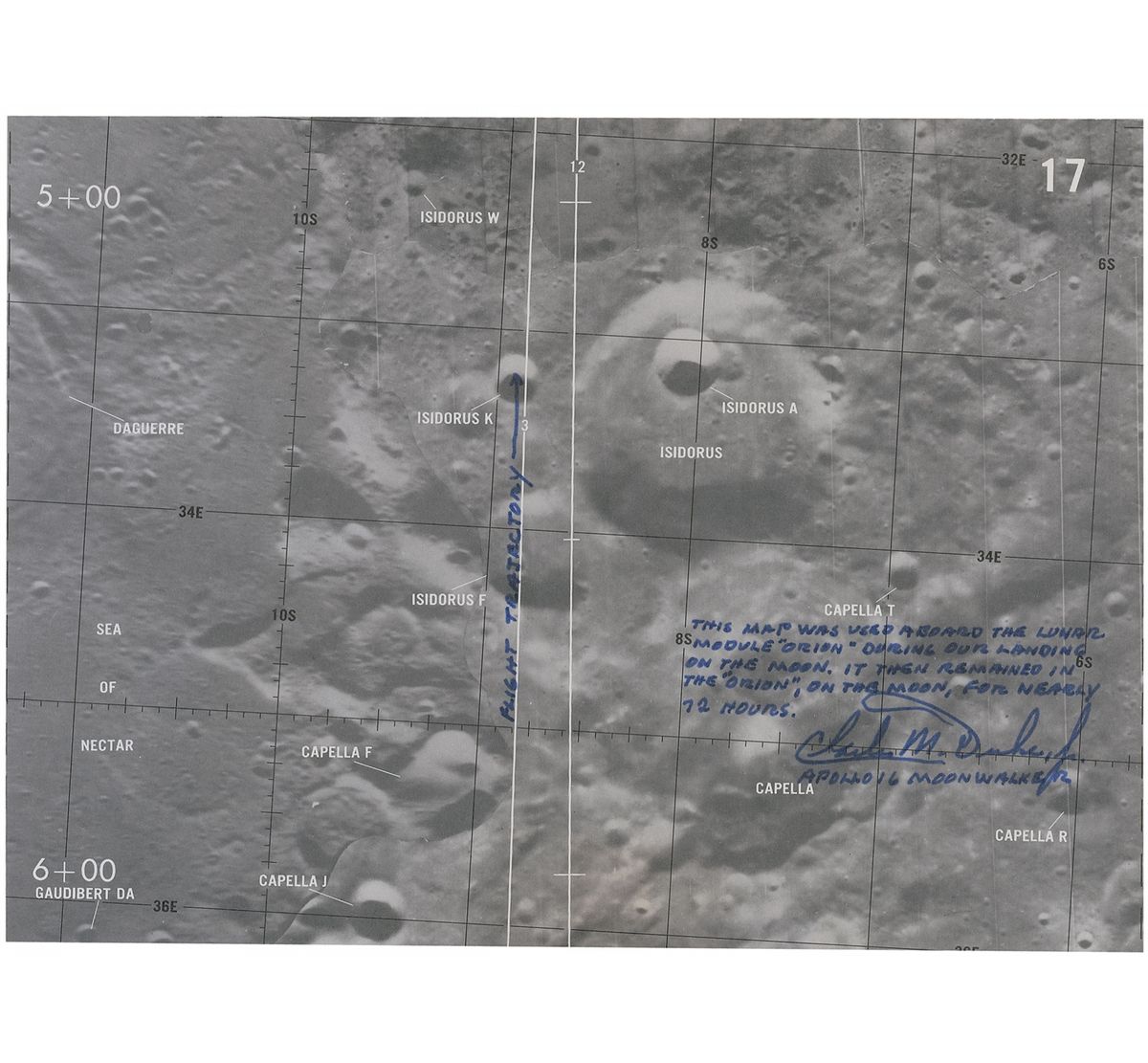 Flown lunar orbital map carried to the lunar surface aboard the LM Orion during the Apollo 16 mission. Map measures 10.5 x 7.75, is labeled “17” in the upper right, and covers longitudes 32E to 36E, with the flight trajectory in the center. This portion shows an area east of their landing site that included part of the Sea of Nectar and the Crater Isidorus. Map is signed in blue felt tip, “This map was used aboard the lunar module ‘Orion’ during our landing on the moon. It then remained in the ‘Orion,’ on the moon, for nearly 72 hours. Charles M. Duke, Jr., Apollo 16 moonwalker.” Duke has also added “flight trajectory” along one of the vertical lines of the map. Map is housed in a sleeve with Duke’s signed personal lunar surface artifact certification label, with a smaller “Flight-Recovered” label initialed by Duke. In fine condition.
