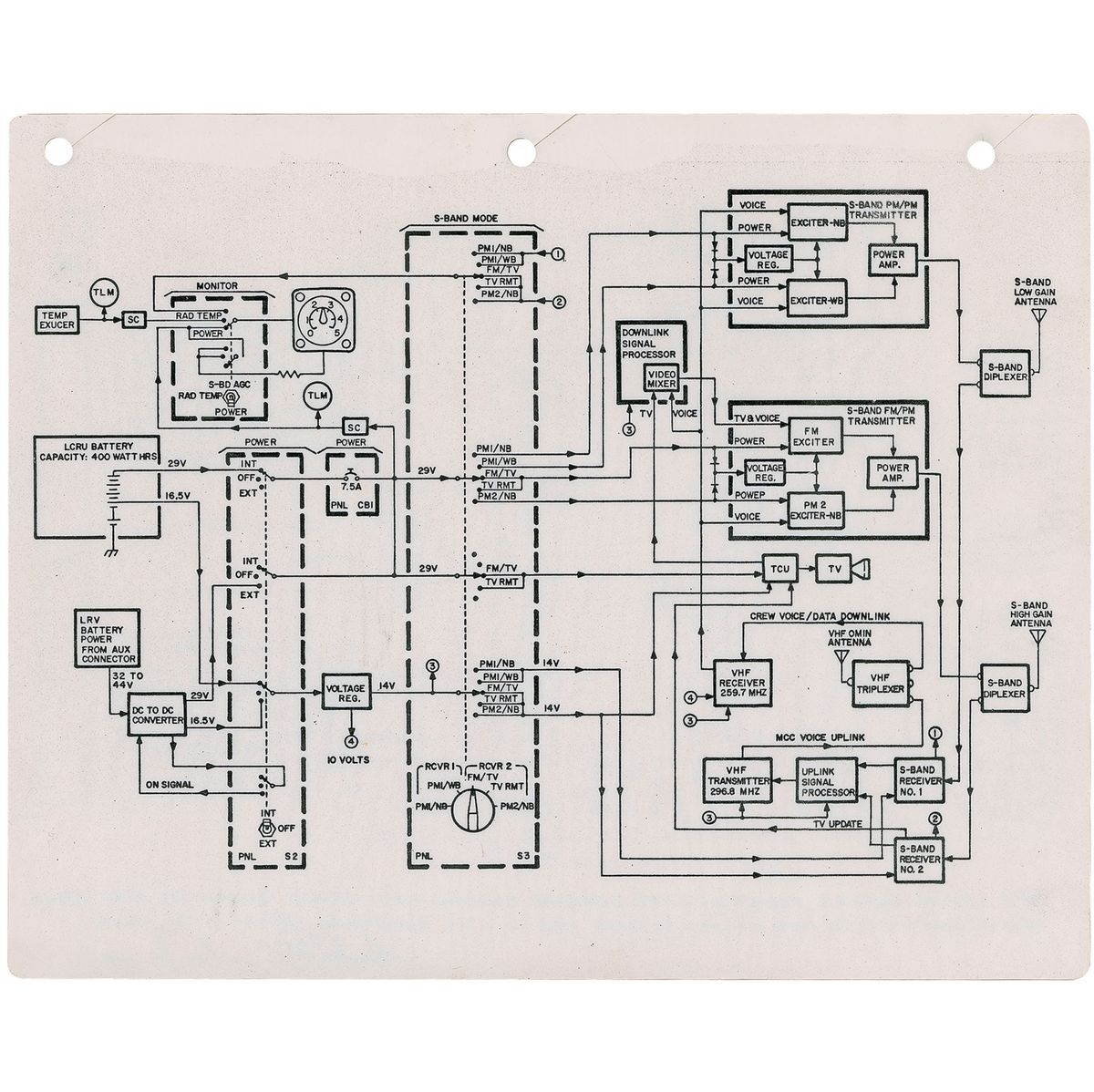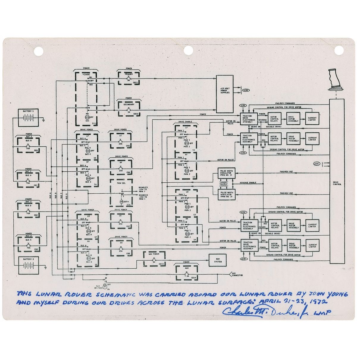 Flown lunar rover schematic used on the lunar surface by Charlie Duke during the Apollo 16 mission. Double-sided schematic is printed on a 10 x 8 sheet of heavy cardstock, with three punch holes to top edge for storage in the Lunar Surface Maps book. One side shows an electrical power diagram from the batteries all the way to the drive control, with the reverse showing the communication circuits. Signed on one side in blue felt tip, “This lunar rover schematic was carried aboard our lunar rover by John Young and myself during our drives across the lunar surface: April 21-23, 1972. Charles M. Duke, Jr., LMP.” In fine condition.