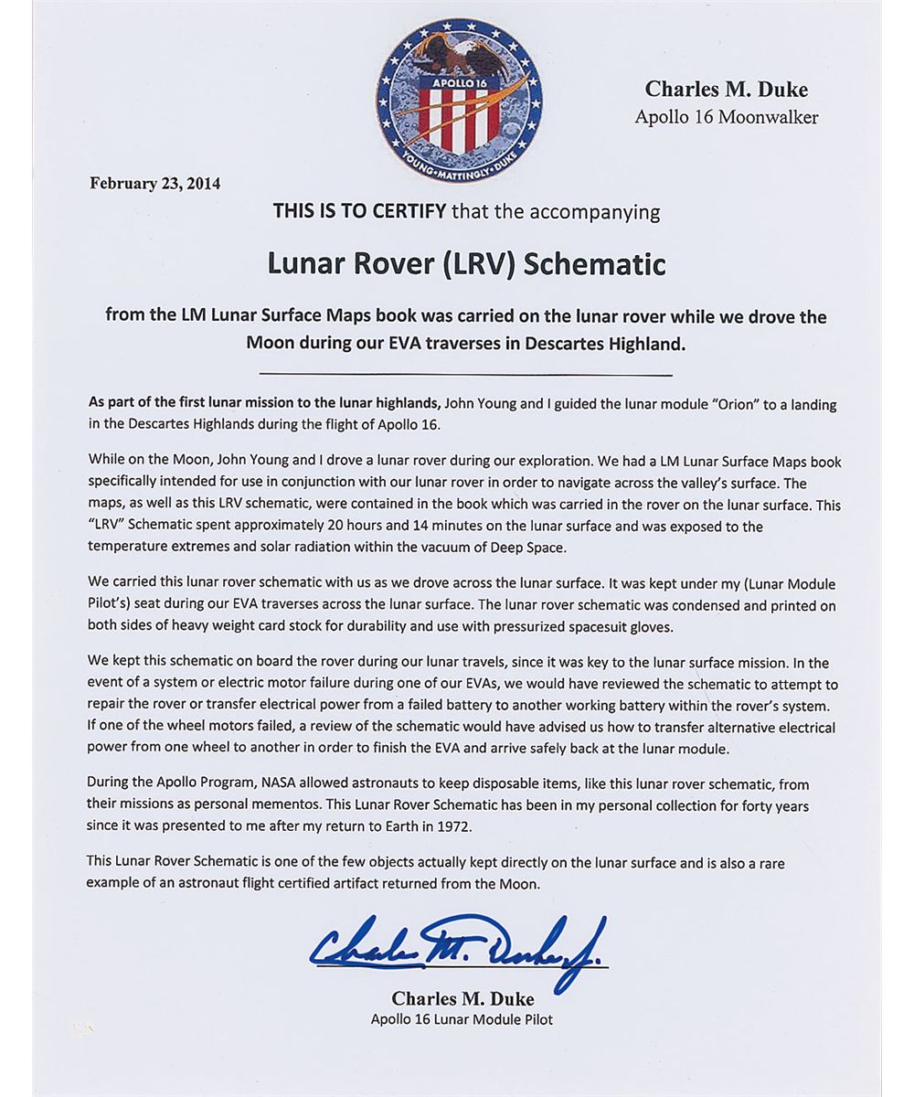 Accompanied by a 2014 letter of authenticity from Duke, which reads, in part: “This is to certify that the accompanying Lunar Rover (LRV) Schematic from the Lunar Surface Maps Book was carried on the lunar rover while we drove the Moon during our EVA traverses in Descartes Highland…While on the Moon, John Young and I drove the lunar rover during our exploration. We had a LM Lunar Surface Maps book…in order to navigate across the valley’s surface. The maps, as well as this LRV schematic, were contained in the book which was carried on the lunar surface. This ‘LRV’ schematic spent approximately 20 hours and 14 minutes on the lunar surface…It was kept under my (Lunar Module Pilot’s) seat during our EVA traverses across the lunar surface…We kept this schematic on board the rover during our lunar travels, since it was key to the lunar surface mission. In the event of a system or electric motor failure during one of our EVAs, we would have reviewed the schematic to attempt to repair the rover…This Lunar Rover Schematic has been in my personal collection for forty years since it was presented to me after my return to Earth in 1972.”