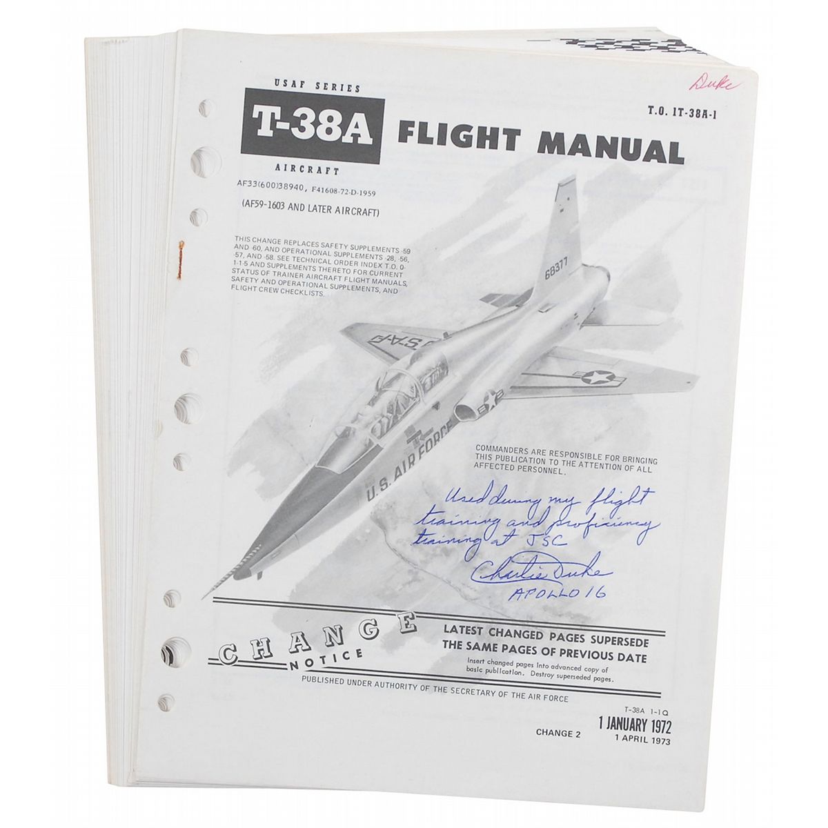 Complete unbound USAF T-38A Aircraft Flight Manual, used by Duke during training. Manual measures 8.25 x 11, is broken into 10 sections, and is dated “Change 2 1 April 1973.” Signed on the front cover, “Used during my flight training and proficiency training at JSC. Charlie Duke, Apollo 16.” In fine condition, with a small red ink notation to top of front cover and a rusty staple mark to left edge of cover.