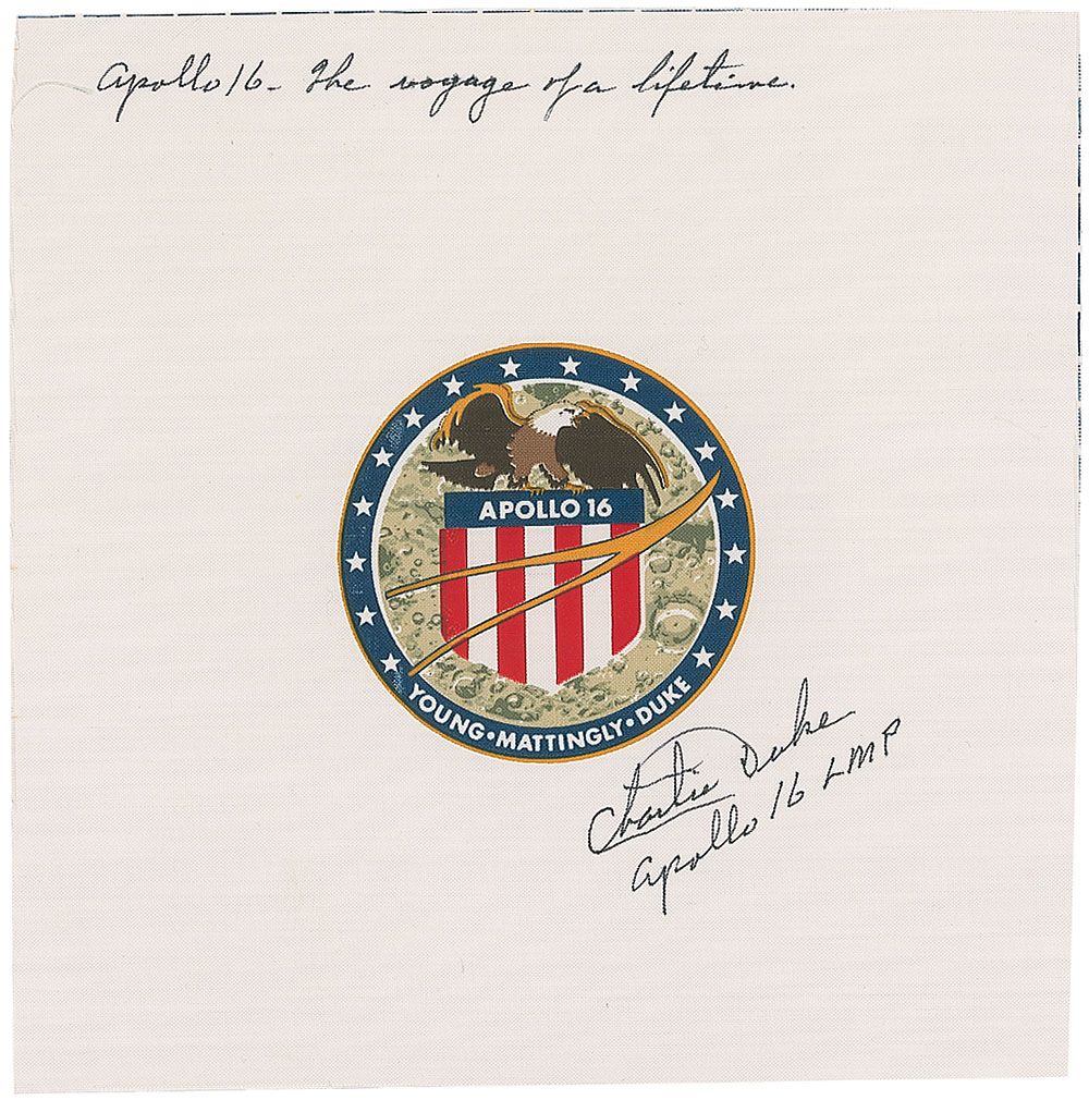 Beta cloth swatch, 9 x 9, with a printed 3.5? diameter Apollo 16 mission emblem in the center, signed in black felt tip, “Apollo 16—The voyage of a lifetime, Charlie Duke, Apollo 16 LMP.” In fine condition.