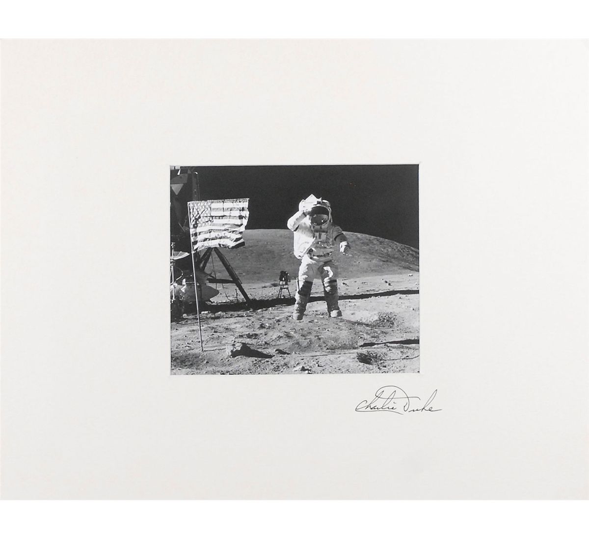 Glossy 10 x 8 photo of John Young leaping in the air as he salutes the American flag, matted to an overall size of 14 x 11, signed on the mat in black felt tip. The reverse of the photo bears a stamp that reads, “NASA authenticated by,” and signed in black felt tip, “Charlie Duke.” In fine condition. Provenance: Superior Auction, Fall 1998. In fine condition.
