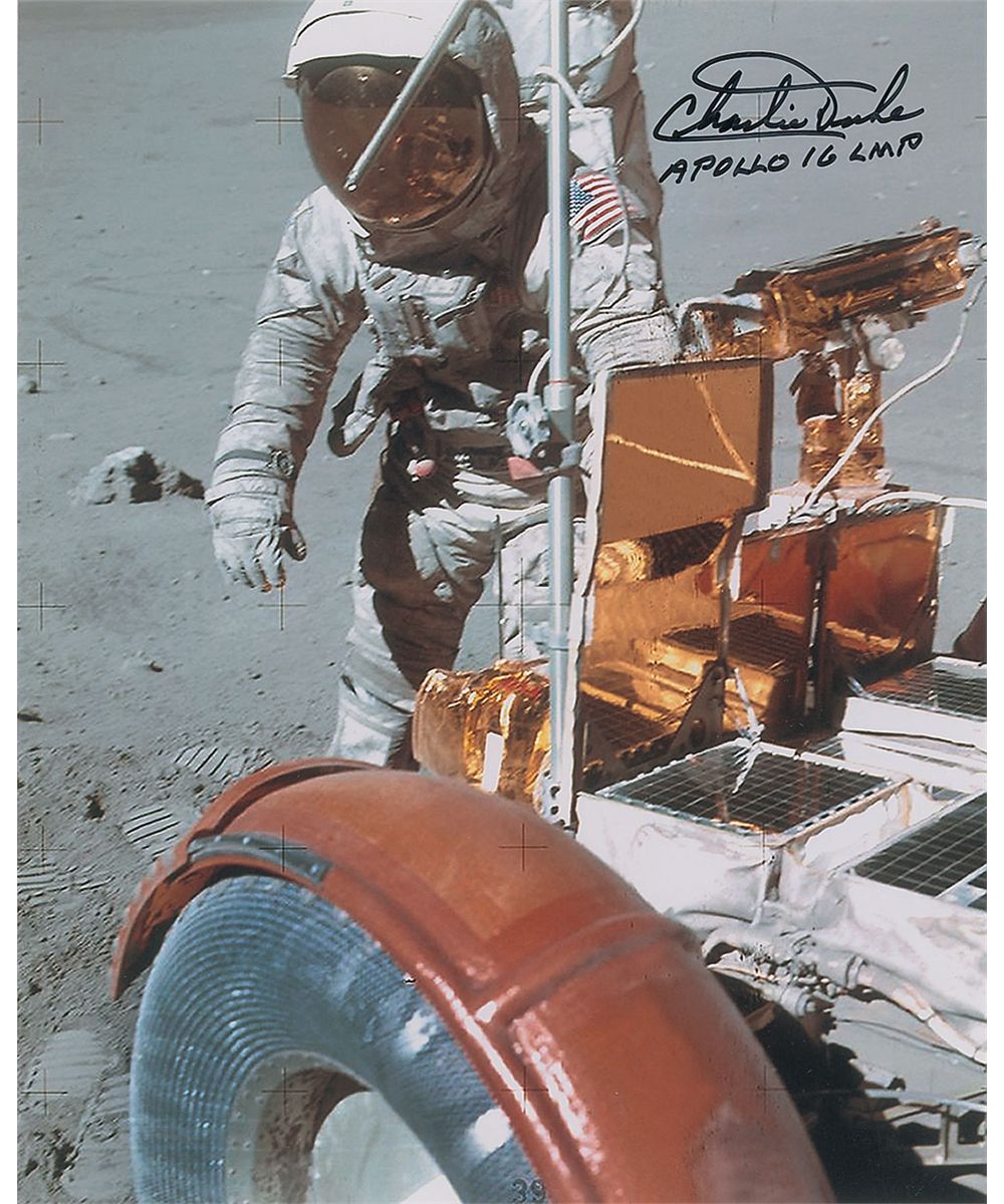 Fantastic color satin-finish 8 x 10 photo of Duke standing next to the lunar rover, signed in black felt tip, “Charlie Duke, Apollo 16 LMP.” In very fine condition. From the Leslie Cantwell collection.