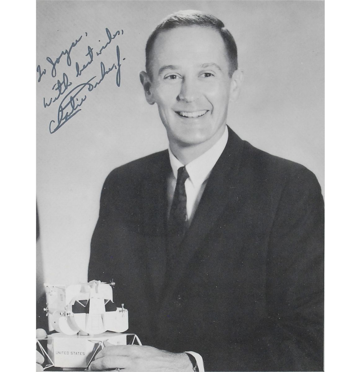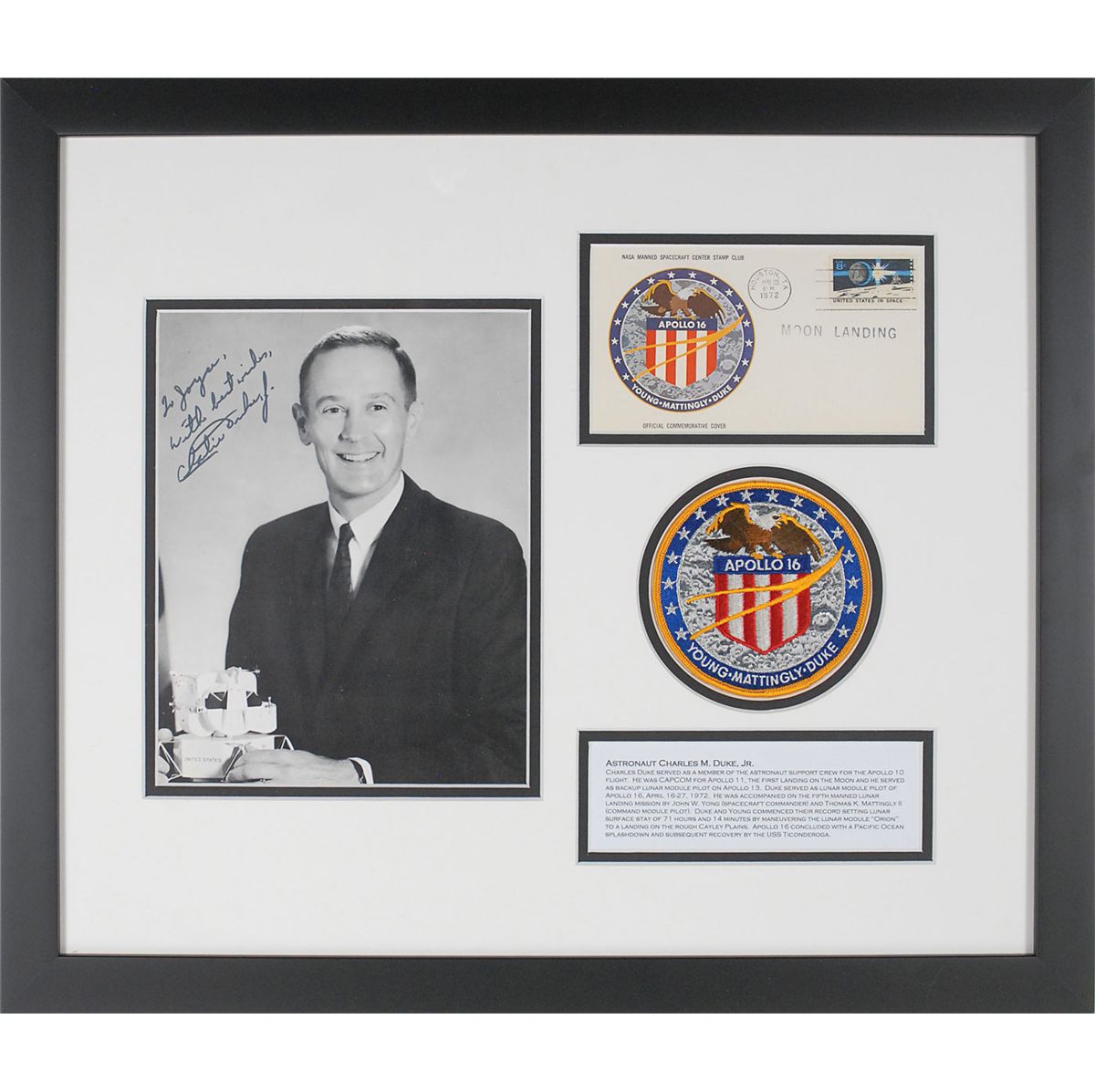 Handsome 8 x 10 portrait of Duke posing with a model of a LEM, signed and inscribed in black felt tip, “To Joyce, with best wishes, Charlie Duke, Jr.” Double-matted and framed with an Apollo 16 patch, an Apollo 16 moon landing commemorative cover, and a printed biography to an overall size of 21 x 18. In fine condition. Inscribed to longtime NASA employee Joyce Abrams, who was a senior member of the ground support team.