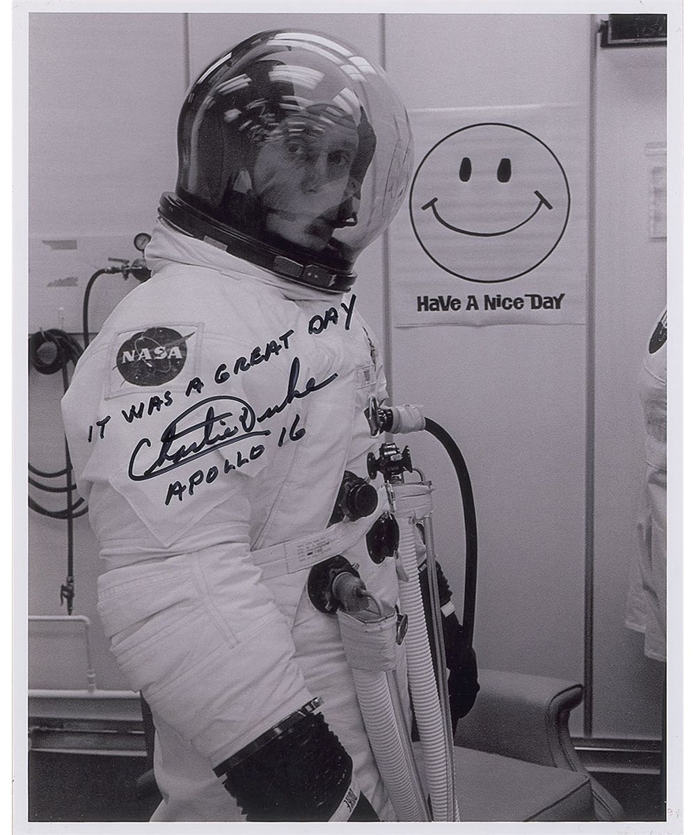 Glossy 8 x 10 photo of Duke suited up for the Apollo 16 launch and standing in front of a ‘Have a Nice Day’ poster, signed in black felt tip, “It was a great day, Charlie Duke, Apollo 16.” In very fine condition. From the Leslie Cantwell collection.