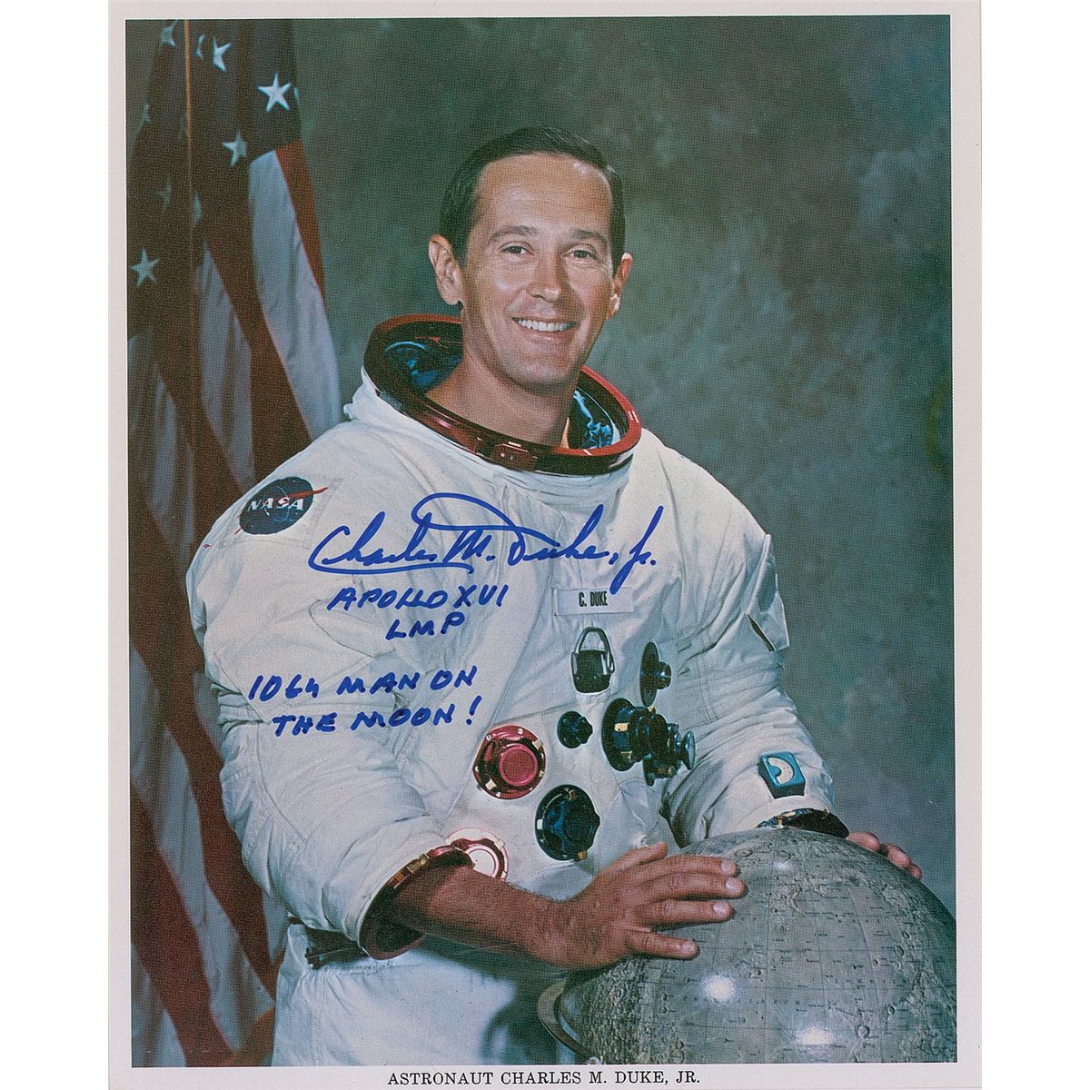 Official color 8 x 10 NASA lithograph of Duke in his white space suit, signed in blue felt tip, “Charles M. Duke, Jr., Apollo XVI LMP, 10th Man on the Moon!” In fine condition.