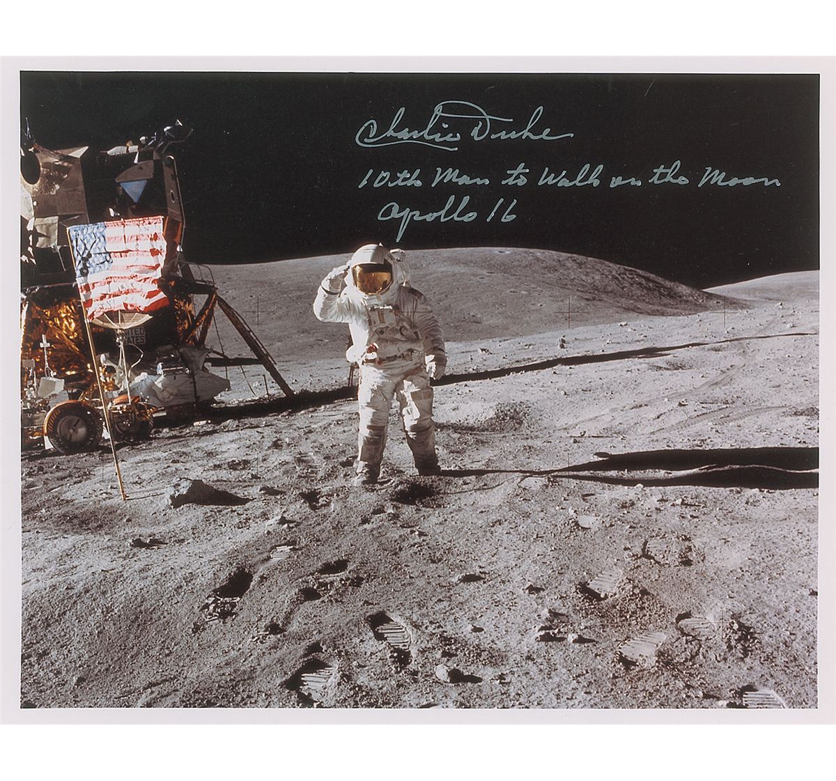 Color satin-finish 10 x 8 photo of Duke on the moon with the Lunar Module and American flag, signed in silver ink, “Charlie Duke, 10th Man to Walk on the Moon, Apollo 16.” In very fine condition.