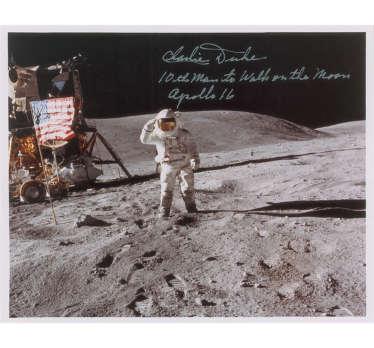 Color satin-finish 10 x 8 photo of Duke saluting the American flag on the moon, signed in silver ink, “Charlie Duke, 10th Man to walk on the Moon, Apollo 16.” In very fine condition.