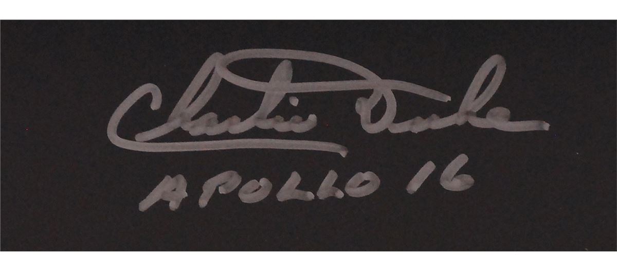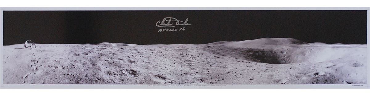 Satin-finish 40.5 x 8.5 panoramic photo of John Young and the lunar rover, with Spook Crater and Stone Mountain visible, signed in silver ink, “Charlie Duke, Apollo 16.” In very fine condition. Rolled.