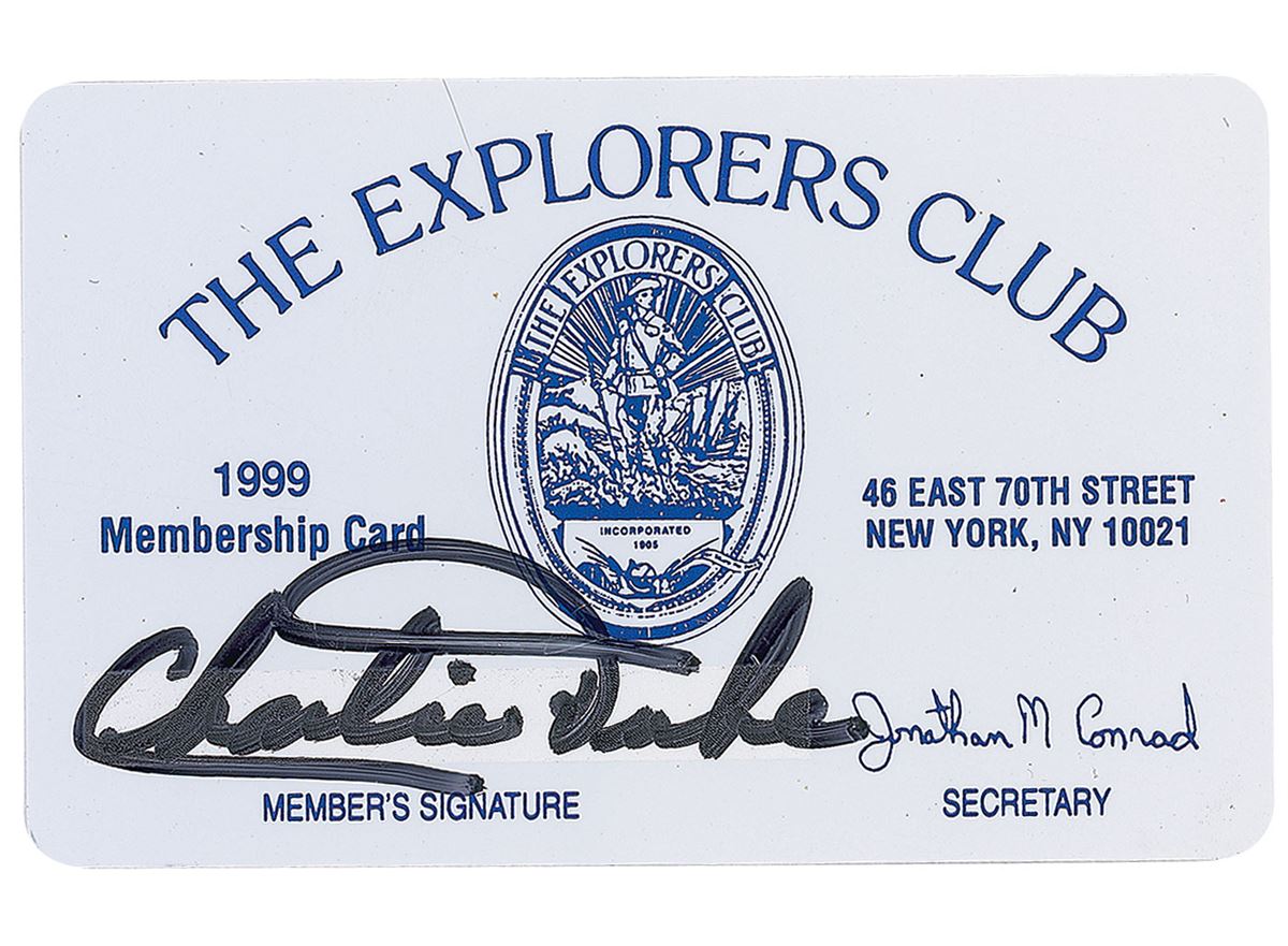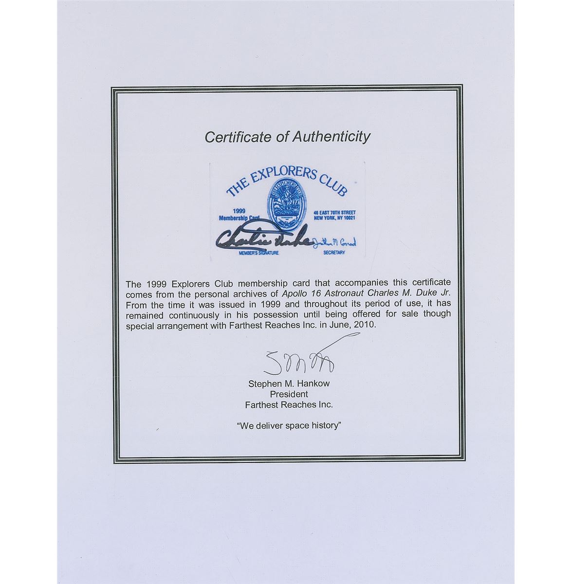 The Explorers Club membership card issued to Charlie Duke in 1999, 3.25 x 2, signed along the bottom in black felt tip. Also bears a facsimile signature of the club’s secretary. In fine condition. Accompanied by a certificate of authenticity from Farthest Reaches. Founded in New York in 1905, The Explorers Club served as a meeting point for explorers and scientists dedicated to the advancement of field research—other members of the organization included Robert Peary, Roald Amundsen, Edmund Hillary, and the Apollo 11 crew.