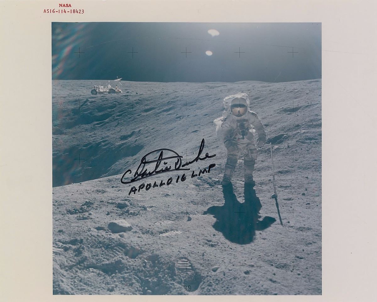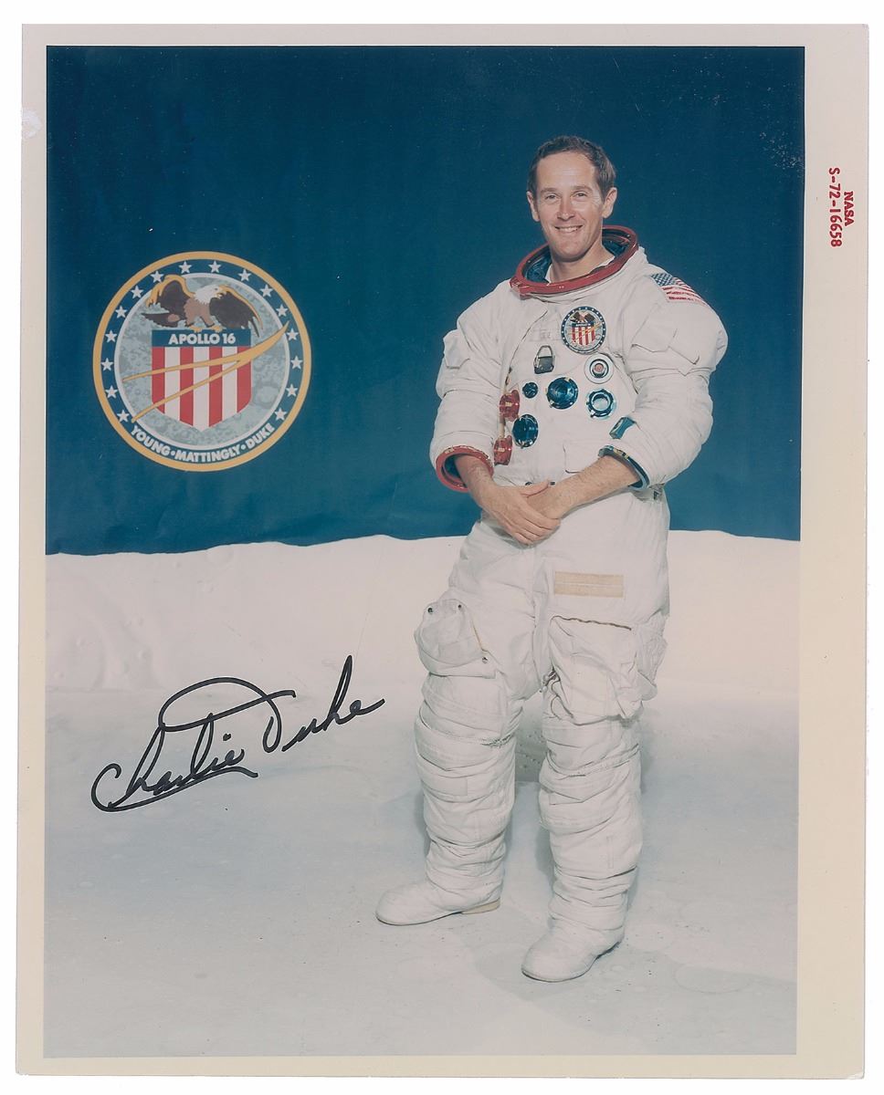 Desirable set of three official color glossy ‘red-numbered’ NASA photos of Duke at various stages of the Apollo 16 mission, 8 x 10 and 10 x 8, each signed in black felt tip. In overall fine condition, with a couple edge dings, and trivial surface impressions and mounting remnants to portrait. The Leon Ford Collection.
