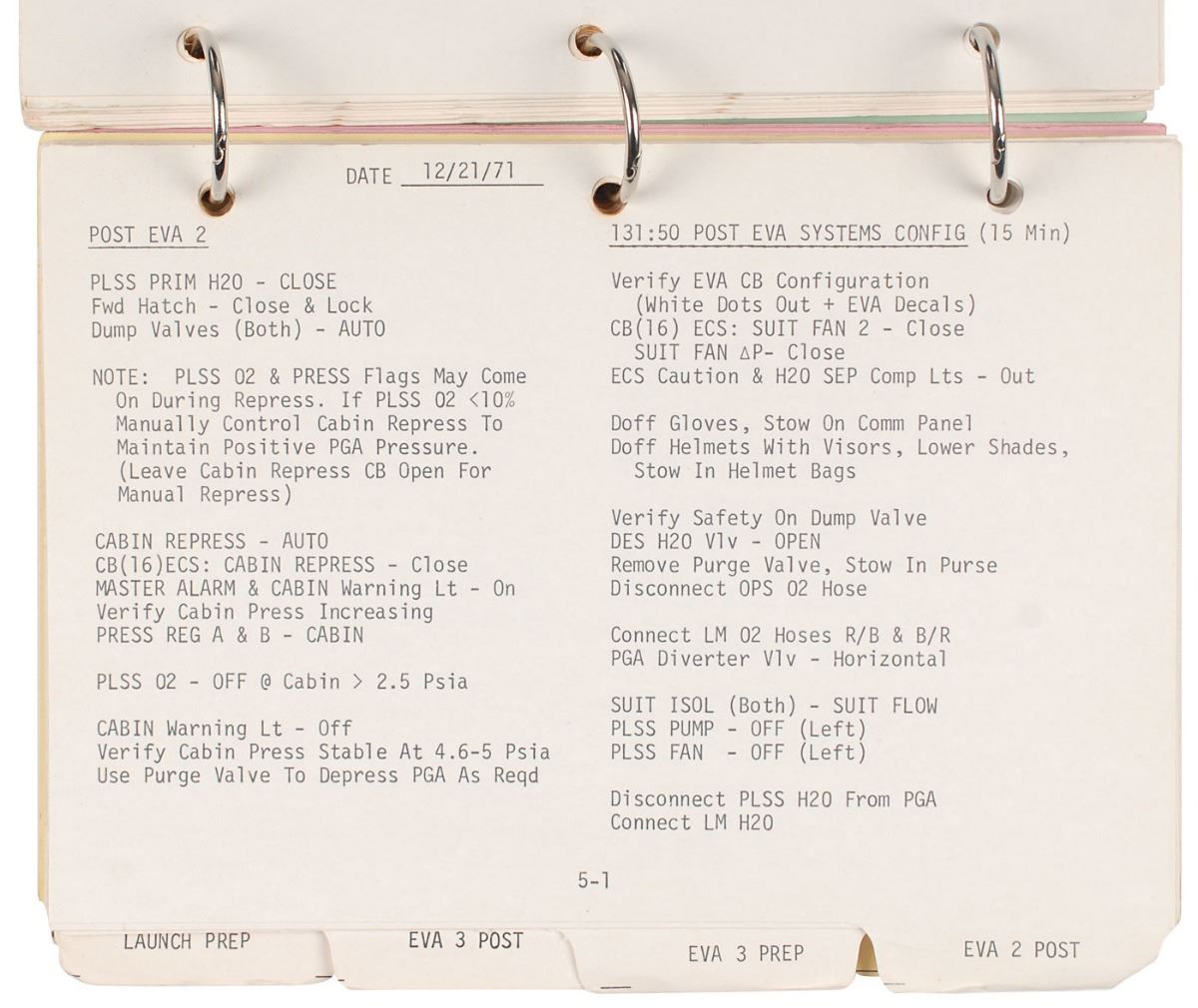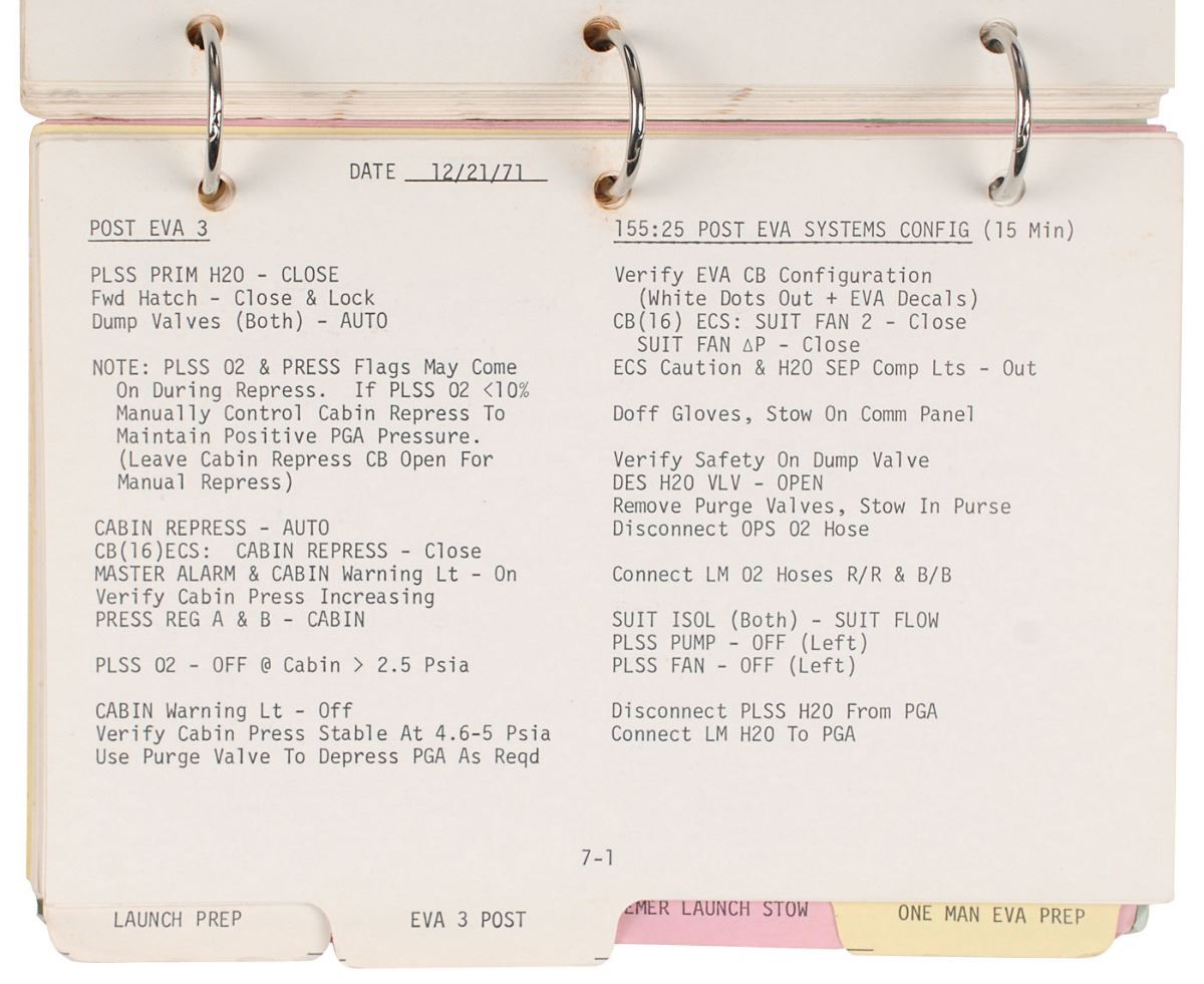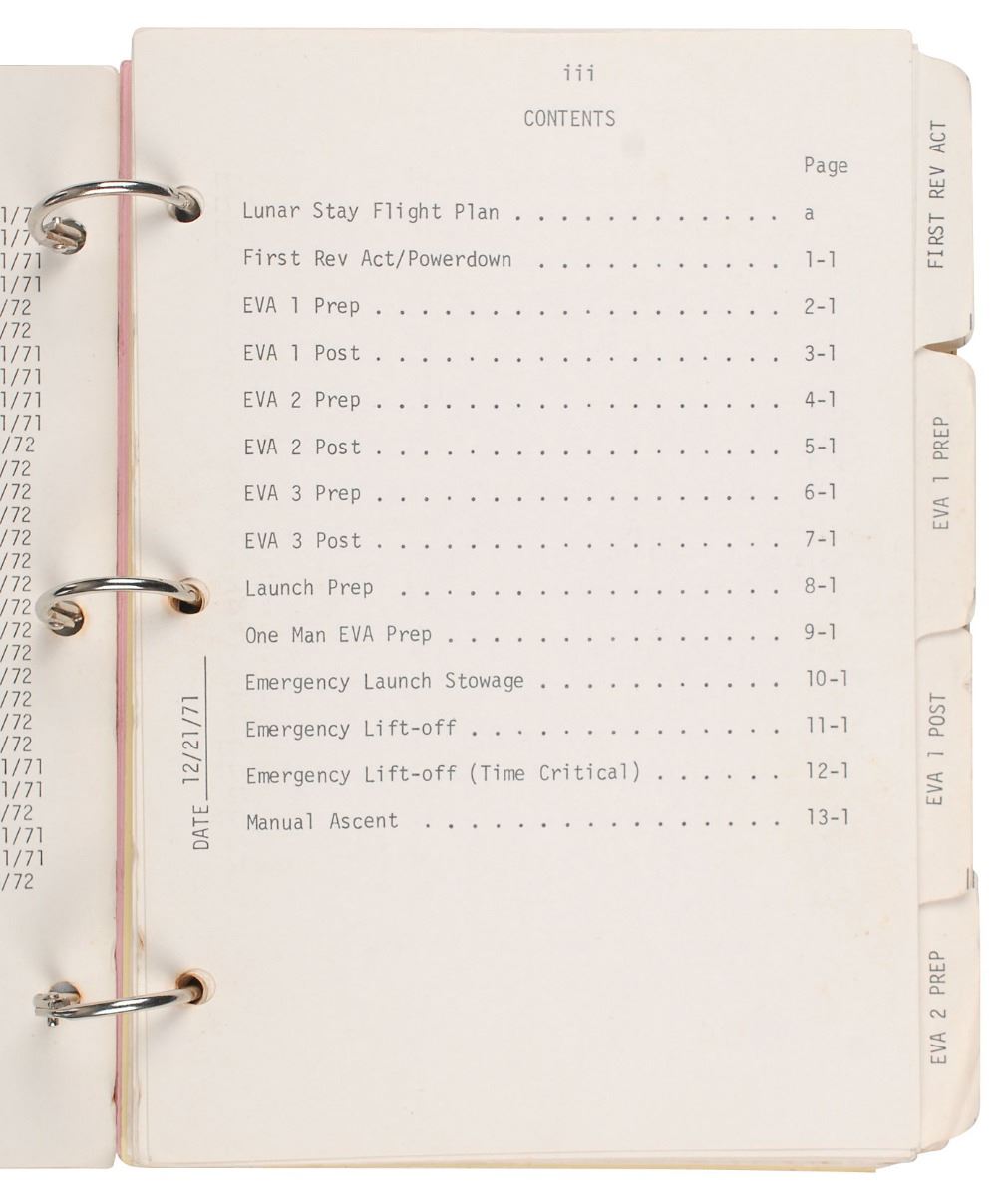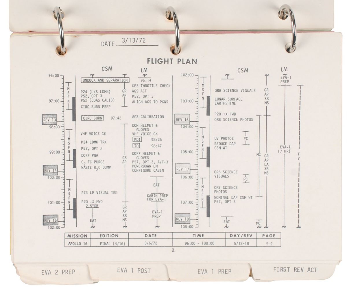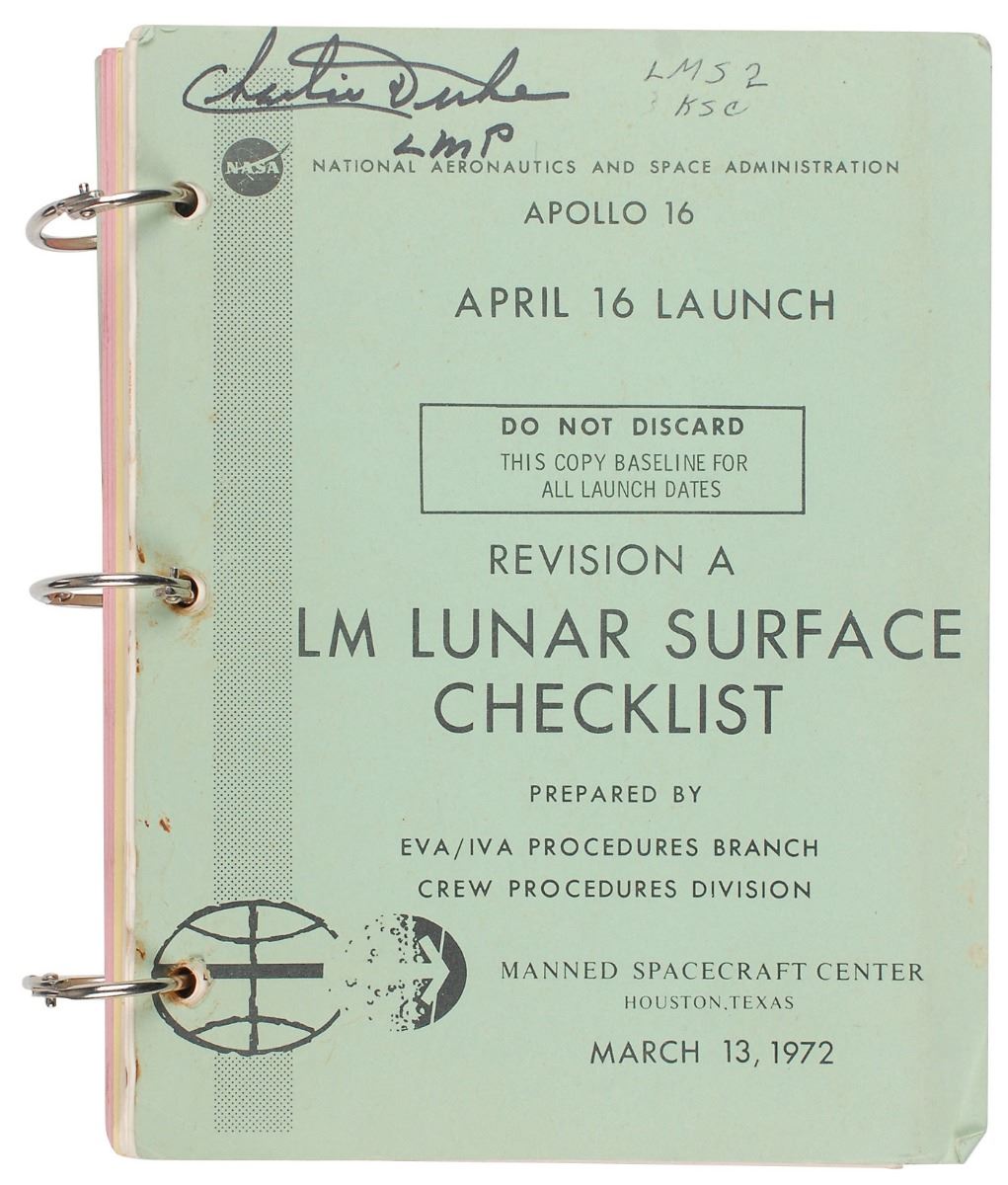 Ring-bound Apollo 16 checklist entitled “Revision A, LM Lunar Surface Checklist,” March 13, 1972, signed on the front cover in black felt tip, “Charlie Duke, LMP.” Also notated in another hand in the upper right, “LMS2, KSC.” Much of the checklist concerns the preparation for the three surface EVAs. General wear and some staining to edges, otherwise fine condition. In total, Duke spent over twenty hours on the lunar surface conducting EVAs, and though unclear whether he used this exact checklist for his training, it certainly represents the extreme detail the crew took to ready for their mission.