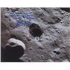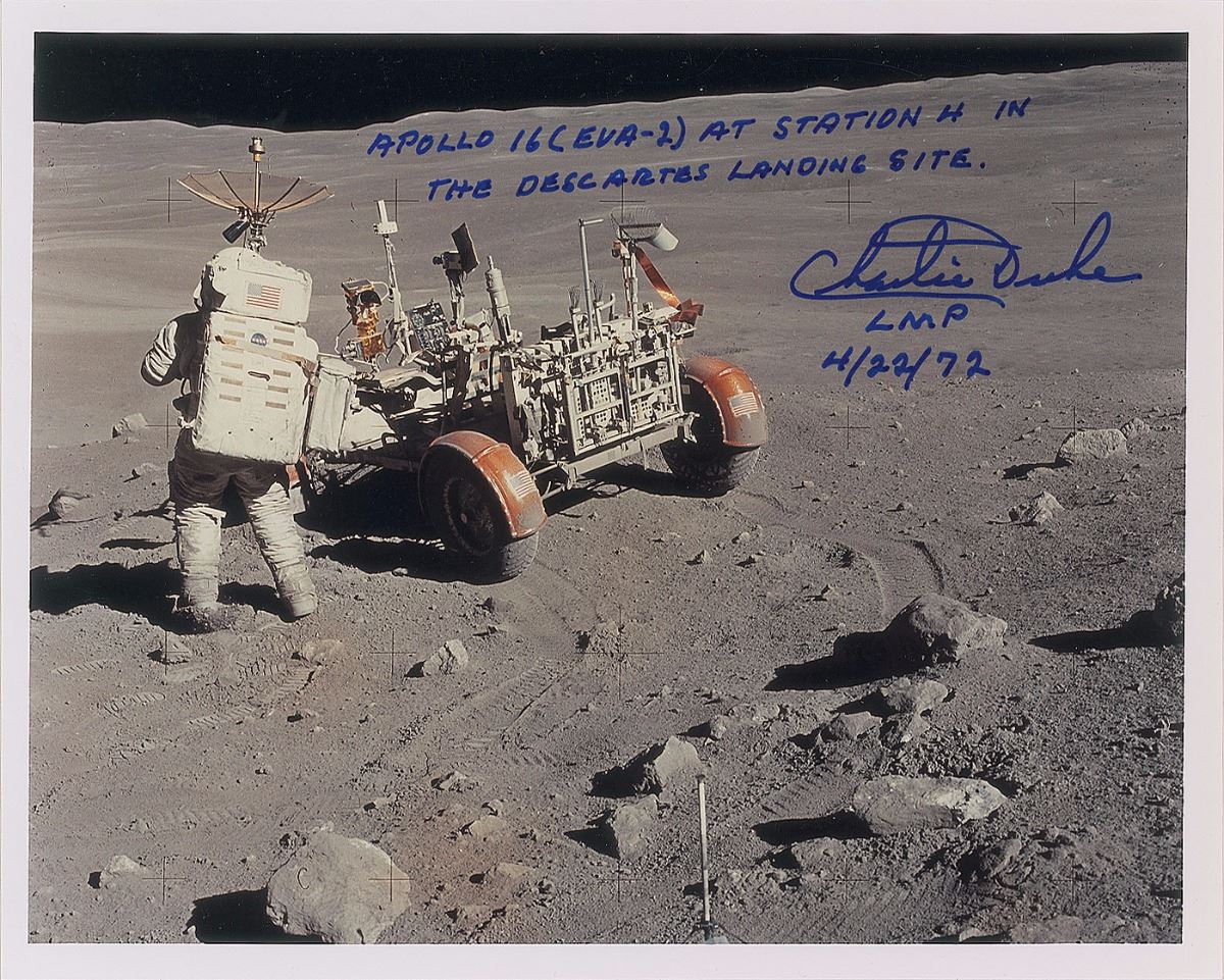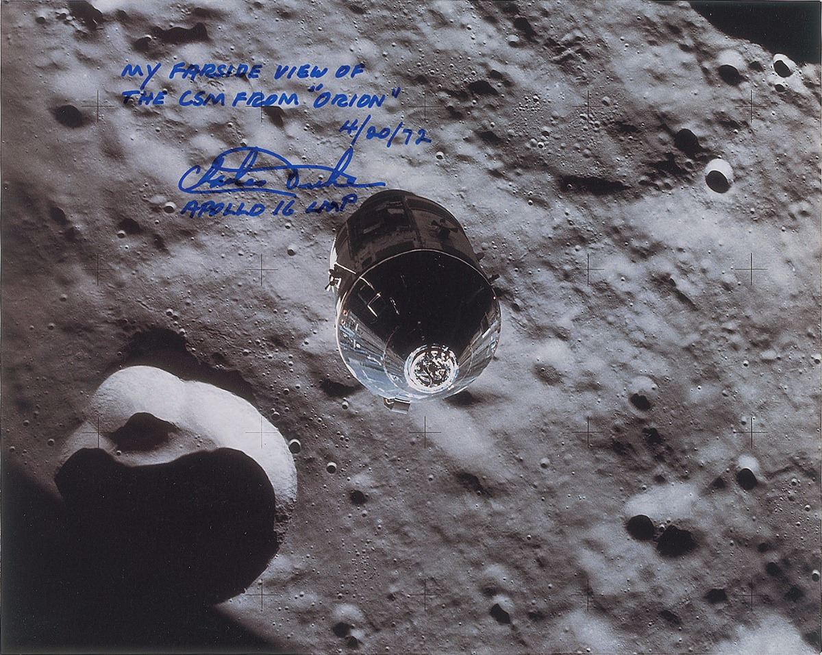 Two photos: a color semi-glossy 10 x 8 photo of the Apollo 16 command module floating above the lunar surface, signed in blue felt tip, “My farside view of the CSM from ‘Orion,’ 4/20/72, Charlie Duke, Apollo 16 LMP”; and a color semi-glossy 10 x 8 photo of an astronaut with the lunar rover on the moon, signed in blue felt tip, “Apollo 16 (EVA–2) at station 4 in the Descartes landing site, Charlie Duke, LMP, 4/22/72.” In overall fine condition.