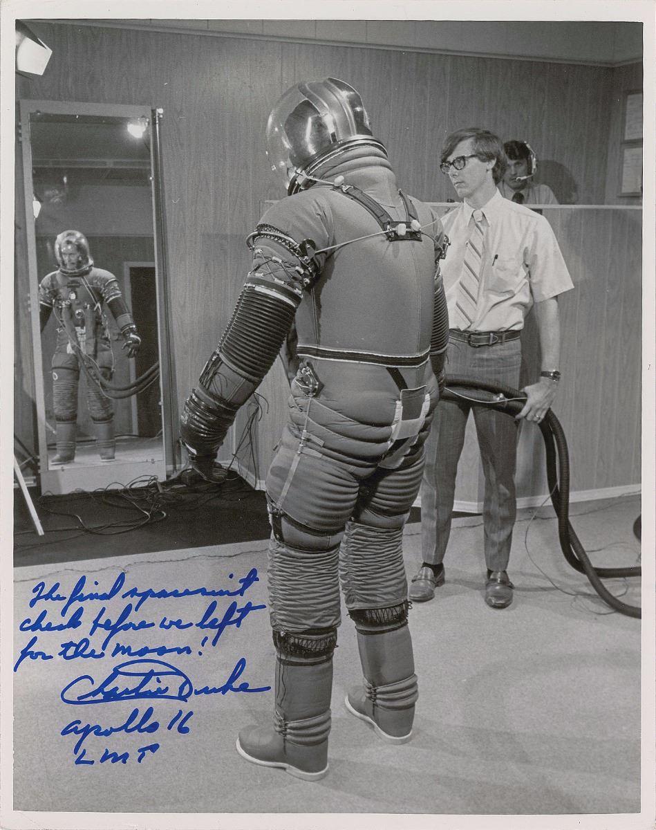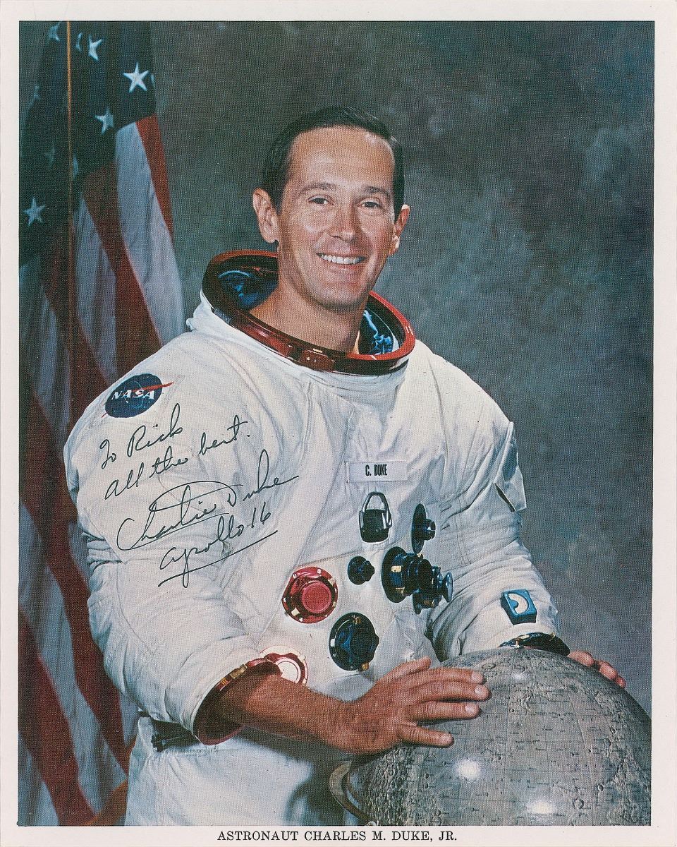 Three photos: an official glossy 8 x 10 NASA photo of Duke testing an Apollo space suit, signed in blue felt tip, “The final spacesuit check before we left for the moon! Charlie Duke, Apollo 16, LMP”; a color satin-finish 7.75 x 10 photo of Duke posing outside a grounded command module, signed in the lower border in black felt tip, “Outside the Apollo XVI command module ‘Casper,’ Charlie Duke, 10th man on the moon”; and an official color 8 x 10 NASA lithograph of Duke posing in his white space suit, signed and inscribed in black ink, “To Rick, All the best. Charlie Duke, Apollo 16.” In overall fine condition.