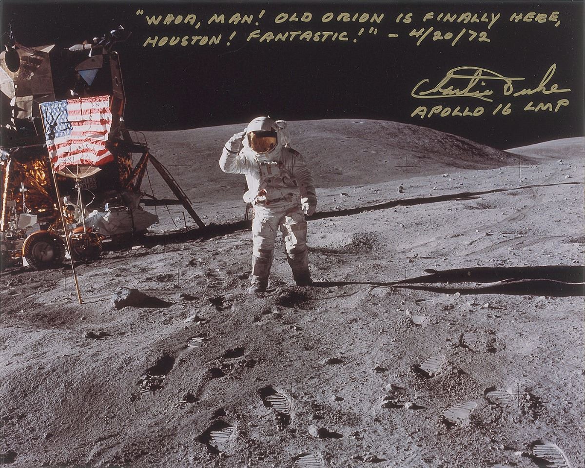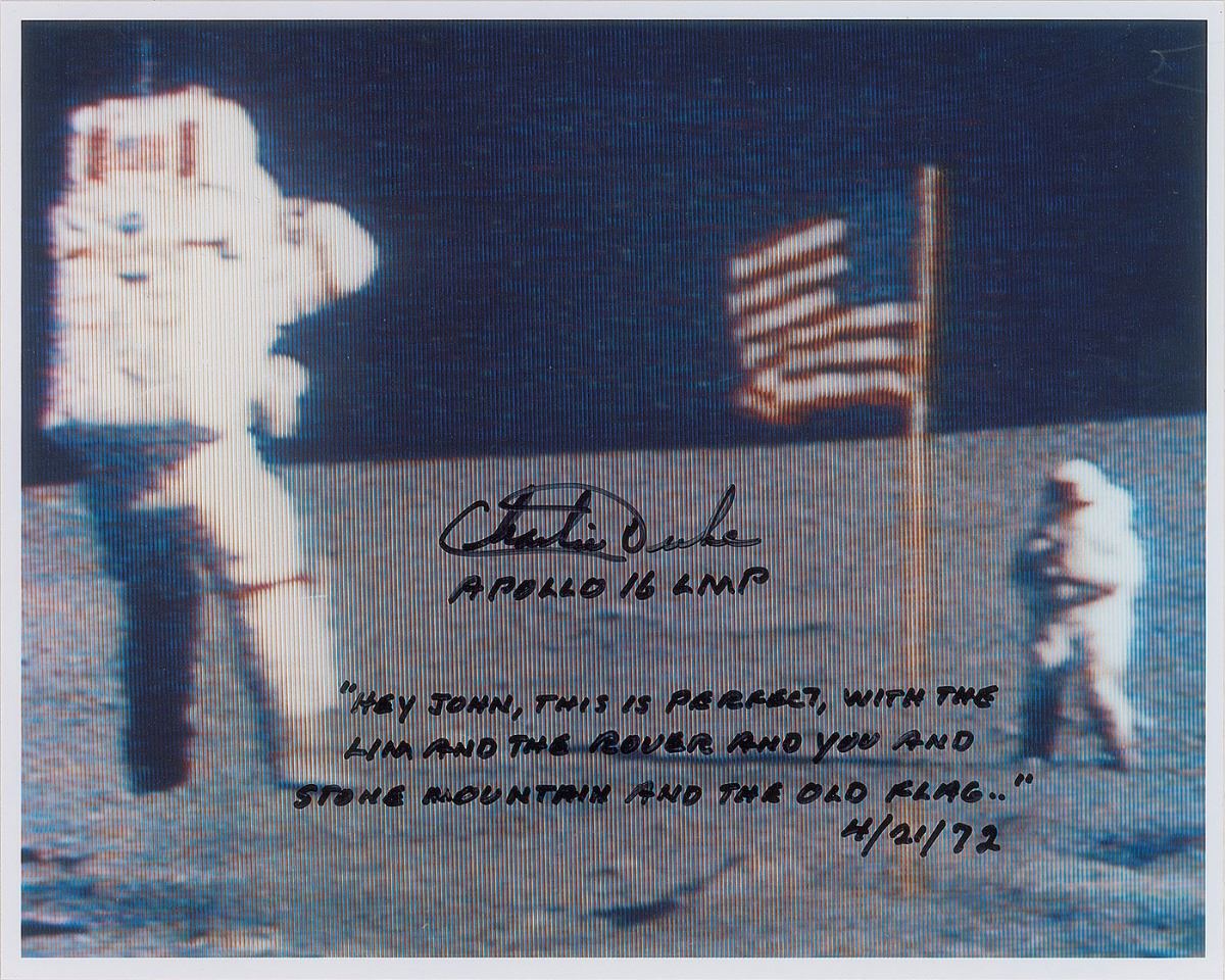 Two photos: a color semi-glossy 10 x 8 photo of Duke saluting the American flag on the lunar surface, signed in gold ink, “‘Whoa, man! Old Orion is finally here, Houston! Fantastic!’—4/20/72, Charlie Duke, Apollo 16 LMP”; and a color satin-finish 10 x 8 photo of a televised image showing two astronauts on the moon, signed in black felt tip, “Charlie Duke, Apollo 16 LMP, ‘Hey John, this is perfect, with the LIM and the rover and you and Stone Mountain and the old flag.’ 4/21/72.” In overall fine condition.