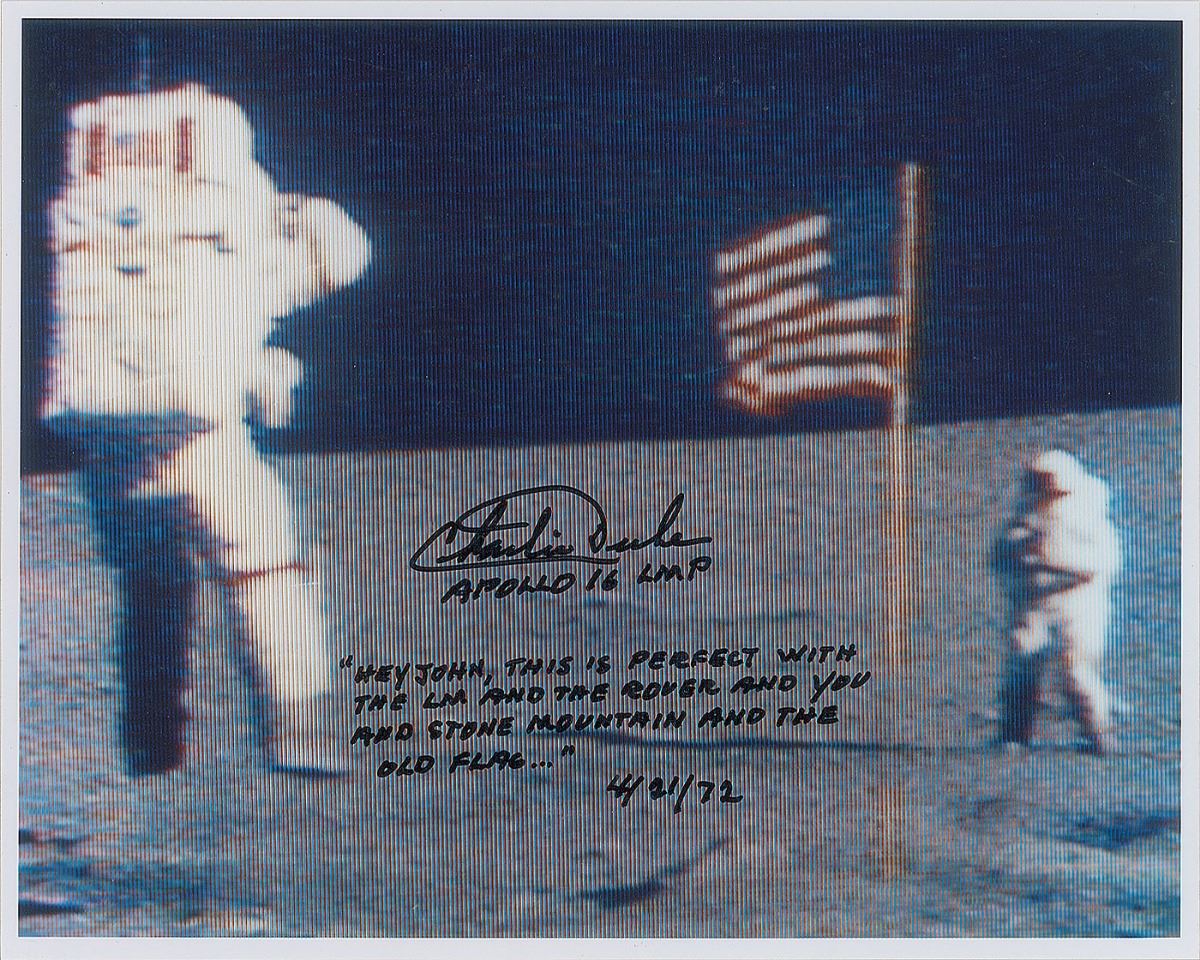 Color satin-finish 10 x 8 photo of a transmission showing Duke with John Young and the American flag on the lunar surface, signed in black felt tip, “Charlie Duke, Apollo 16 LMP, ‘Hey John, this is perfect with the LM and the Rover and you and stone mountain and the old flag…’ 4/21/72.” In fine condition.