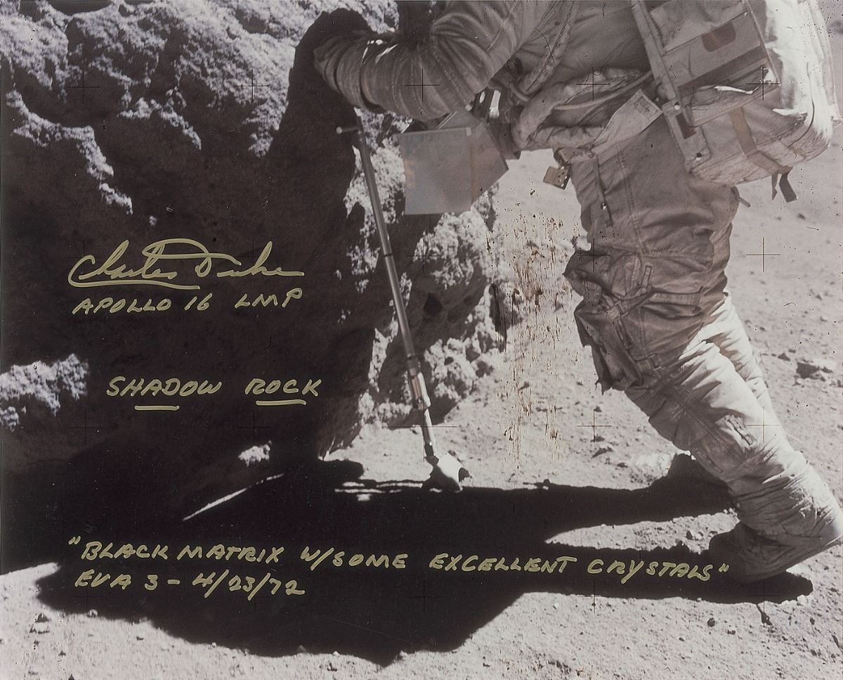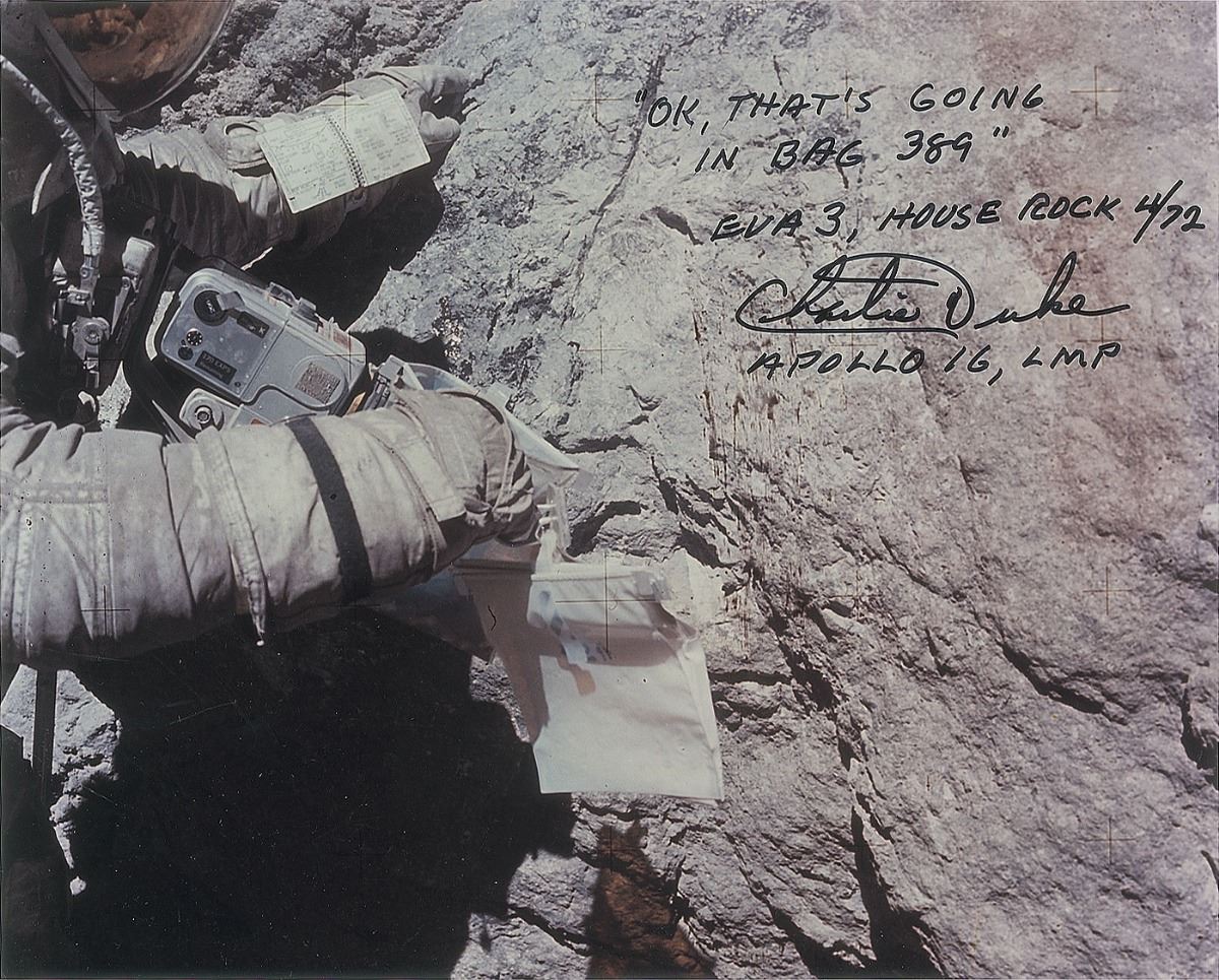Three photos: a color semi-glossy 10 x 8 photo of an astronaut collecting rock material on the moon, signed in black felt tip, “‘Ok, that’s going in bag 389,’ EVA 3, house rock 4/72, Charlie Duke, Apollo 16, LMP”; a color semi-glossy 10 x 8 photo of a module hovering high above the lunar surface, signed in black felt tip, “‘Man, Ken, we got a load or rocks!’ 4/23/72, Charles Duke, Apollo 16 LMP”; and a color semi-glossy 10 x 8 photo of an astronaut preparing to collect some lunar rocks, signed in gold ink, “Charles Duke, Apollo 16 LMP, Shadow rock, ‘Black matrix w/ some excellent crystals,’ EVA 3—4/23/72.” In overall fine condition.