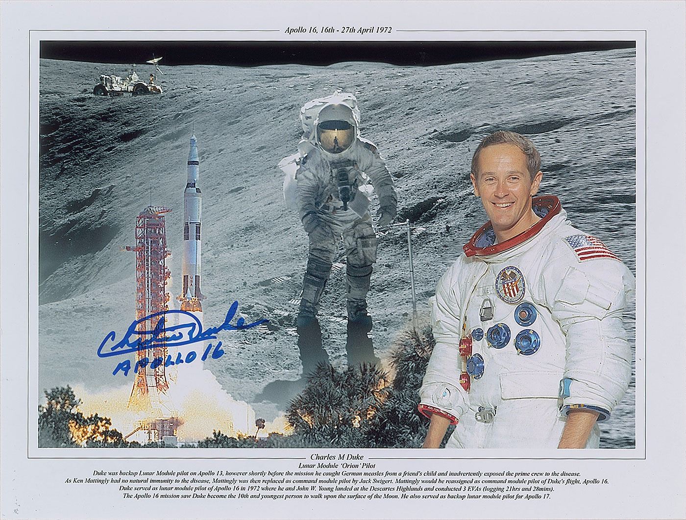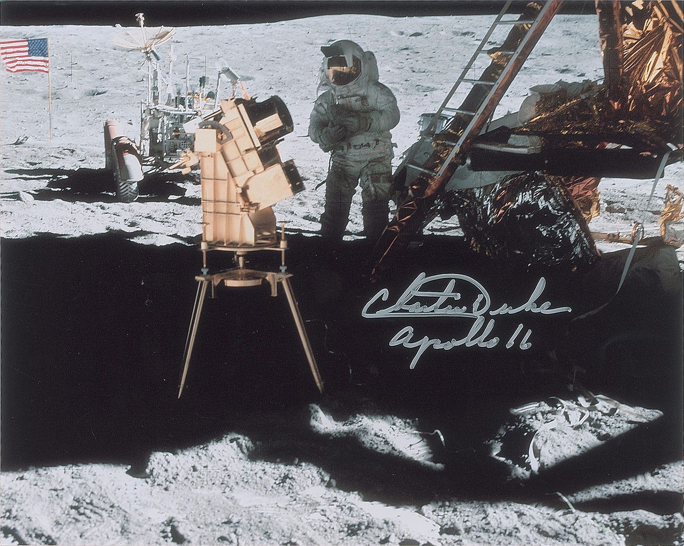 Three photos: a color glossy 10.5 x 8 photo of images celebrating LMP Charles M. Duke, signed in blue felt tip, "Charlie Duke, Apollo 16"; a color semi-glossy 8 x 10 photo of Duke next to the lunar rover on the moon's surface, signed in black felt tip, "Charlie Duke, Apollo 16 LMP"; and a color semi-glossy 10 x 8 photo of Duke standing in the shadow of the lunar module on the surface of the moon, signed in silver ink, "Charlie Duke, Apollo 16." Reverse of largest photo bears an affixed label from the Astronaut Scholarship Foundation certifying that the autograph was signed for the organization. In overall fine condition.