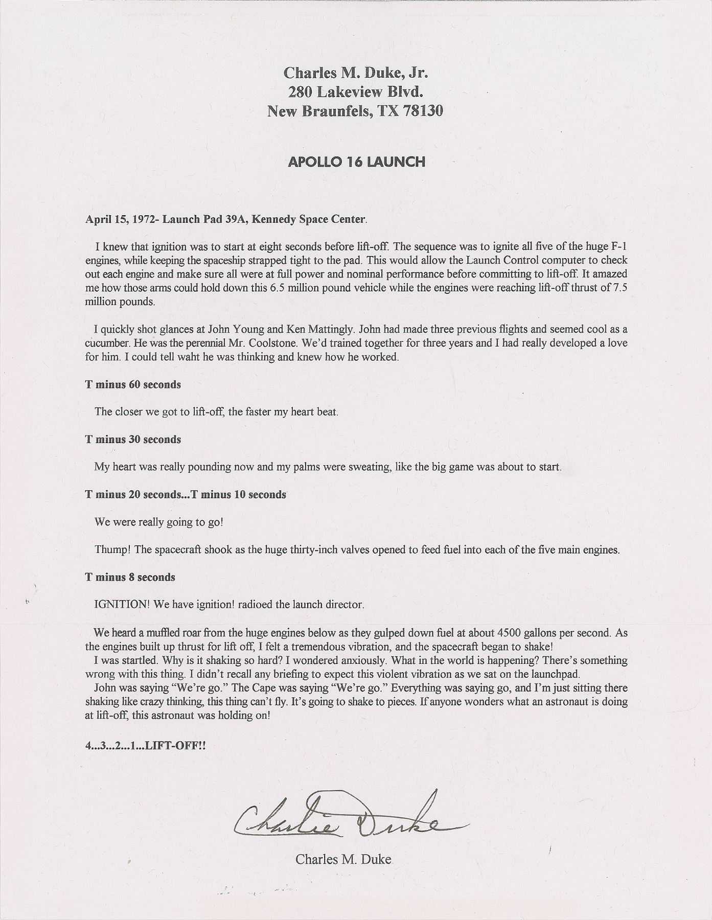 Uncommon souvenir typescript detailing Lunar Module Pilot Duke's perspective of the "Apollo 16 Launch," one page, 8.5 x 11, signed at the conclusion in black ink. In part: "T minus 60 seconds, The closer we got to lift-off, the faster my heart beat. T minus 30 second, My heart was really pounding now and my palms were sweating, like the big game was about to start. T minus 20 seconds…T minus 10 seconds, We were really going to go! Thump! The spacecraft shook as the huge thirty-inch valves opened to feed fuel into each of the five main engines. T minus 8 seconds, IGNITION! We have ignition! radioed the launch director…We heard a muffled roar from the huge engines below as they gulped down fuel at about 4500 gallons per second. As the engines built up thrust for lift off, I felt a tremendous vibration, and the spacecraft began to shake!…If anyone wonders what an astronaut is doing at lift-off, this astronaut was holding on! 4…3…2…1…LIFT–OFF!!" In fine condition.