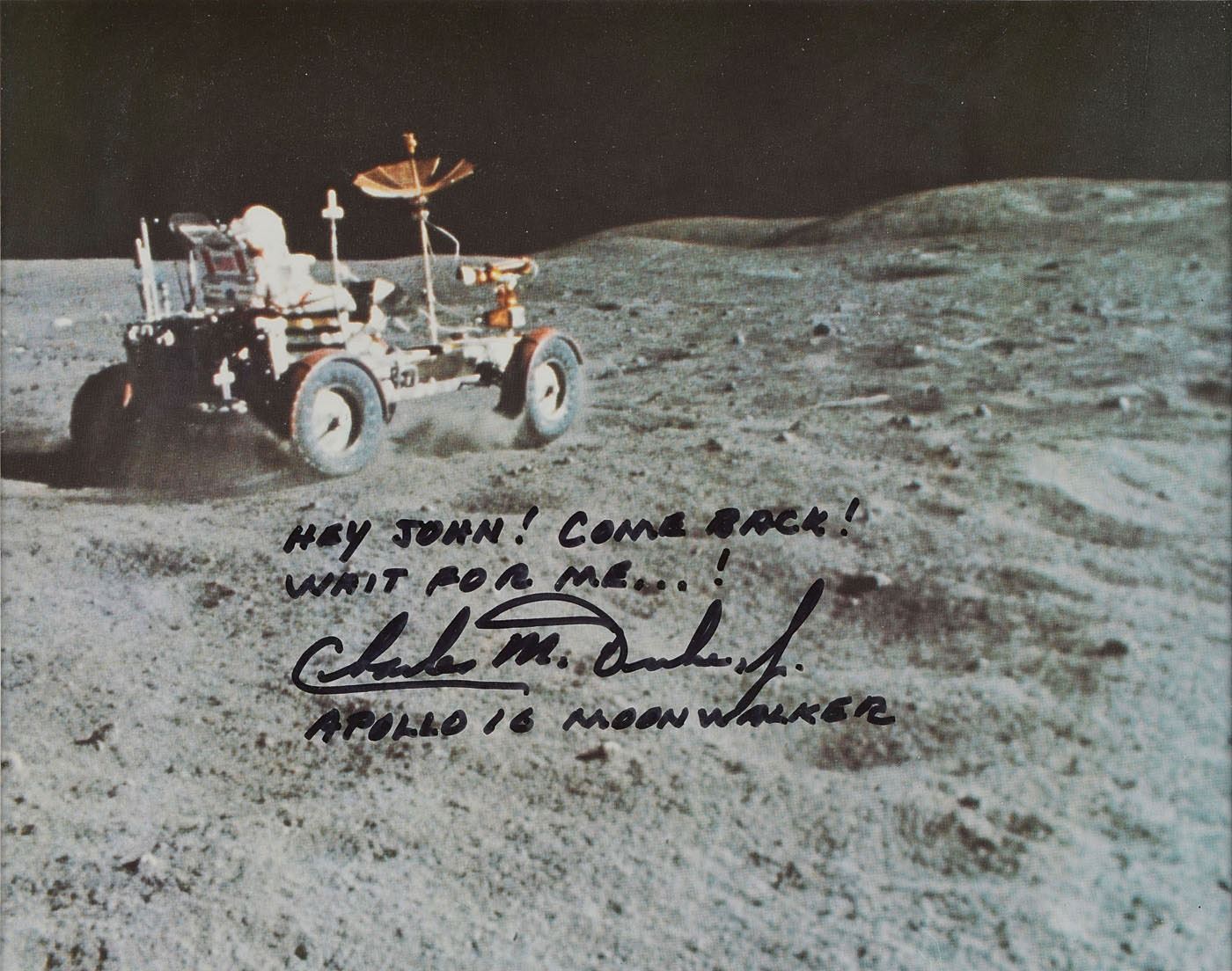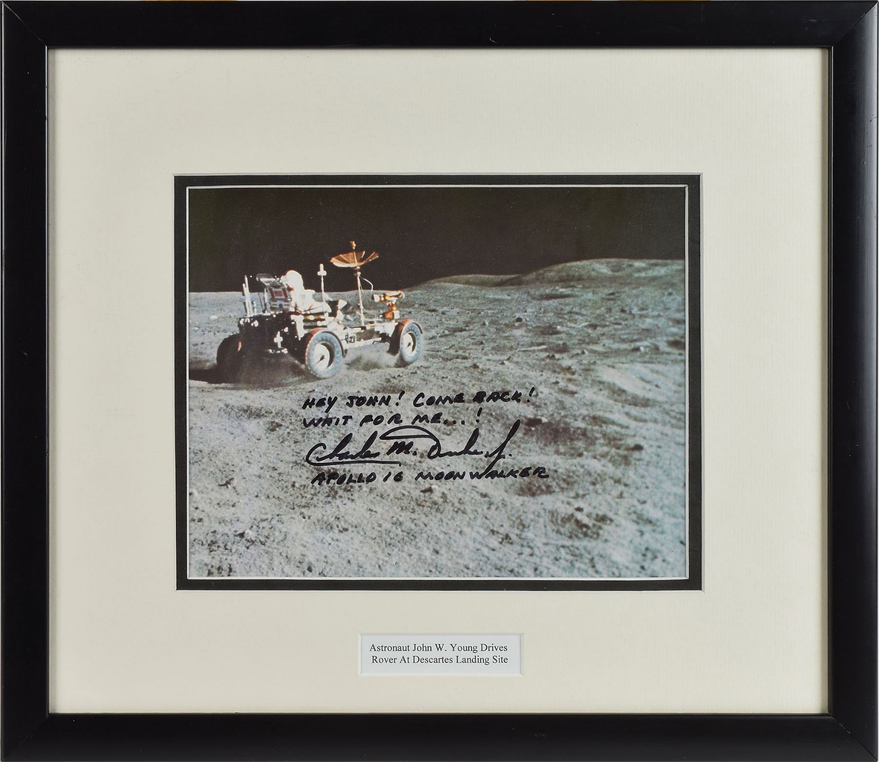 Official color 9.25 x 7.25 NASA lithograph of Commander John Young driving the lunar roving vehicle during the third Apollo 16 EVA at the Descartes landing site, signed and inscribed in black felt tip, "Hey John! Come back! Wait for me…! Charles M. Duke, Jr., Apollo 16 Moonwalker.” Archivally double-matted and framed with a caption to an overall size of 16.25 x 14.25; back of frame bears an affixed copy of lithograph reverse text. In fine condition.