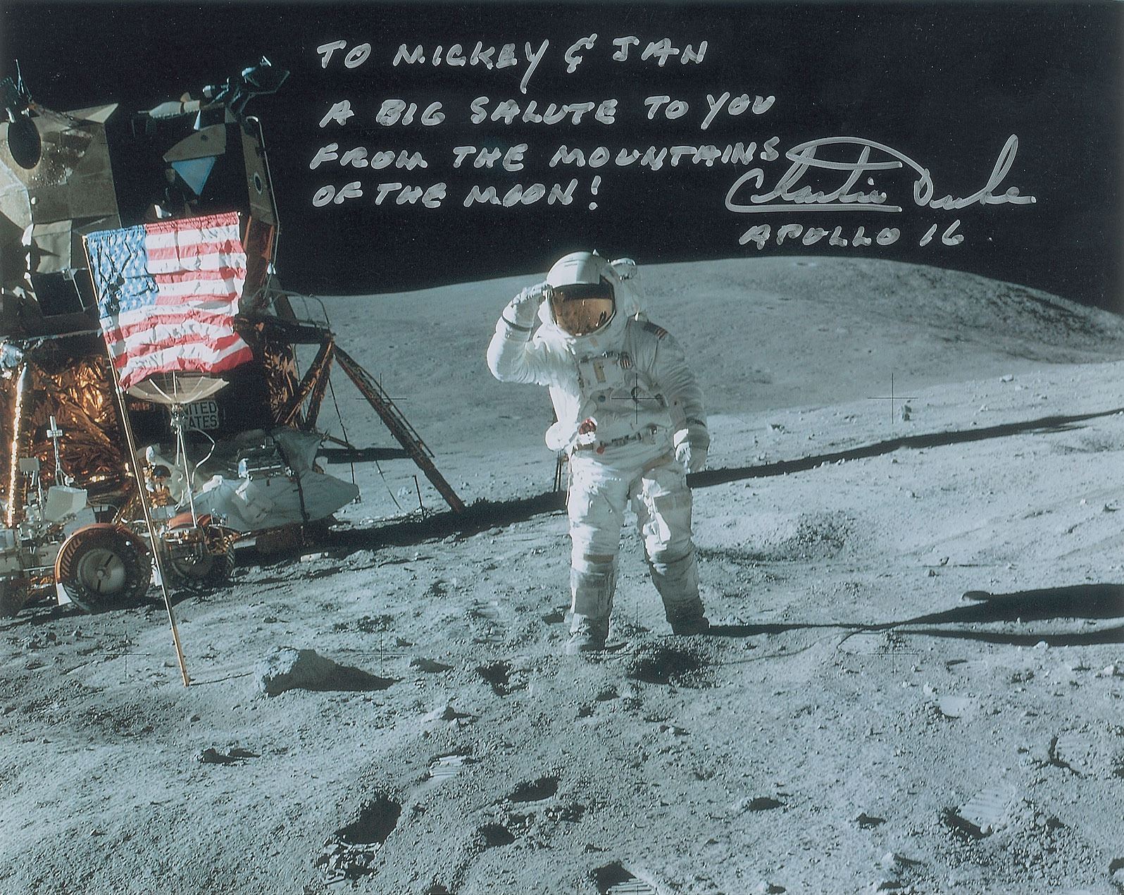Color glossy 10 x 8 full-length photo of Duke saluting the American flag during an Apollo 16 EVA, signed and inscribed in silver ink, "To Mickey & Jan, a big salute to you from the mountains of the moon! Charlie Duke, Apollo 16.” In fine condition.
