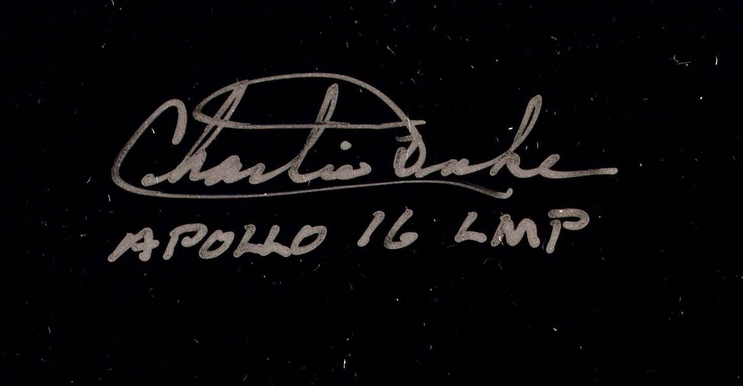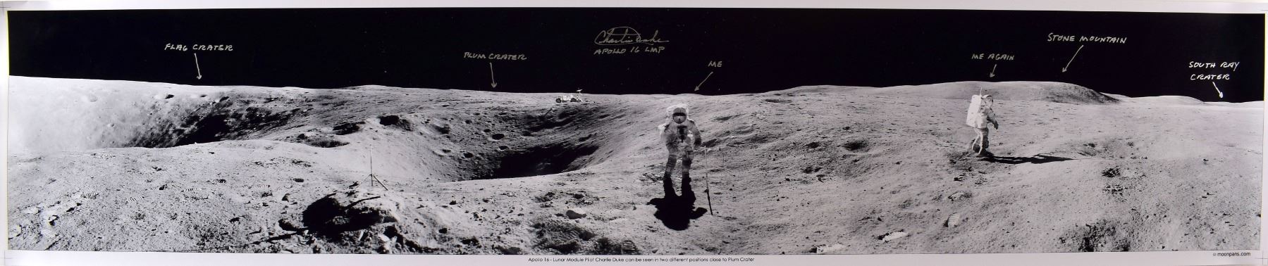 Fantastic color satin-finish 40 x 8.5 panoramic photo of LMP Duke in two different positions while exploring close to Plum Crater, signed in silver ink, "Charlie Duke, Apollo 16 LMP," and annotated in Duke's hand to identify important landmarks: "Flag Crater," "Plum Crater," "Me," "Me Again," "Stone Mountain," and "South Ray Crater." In fine condition. Accompanied by a certificate of authenticity from Moonpans.