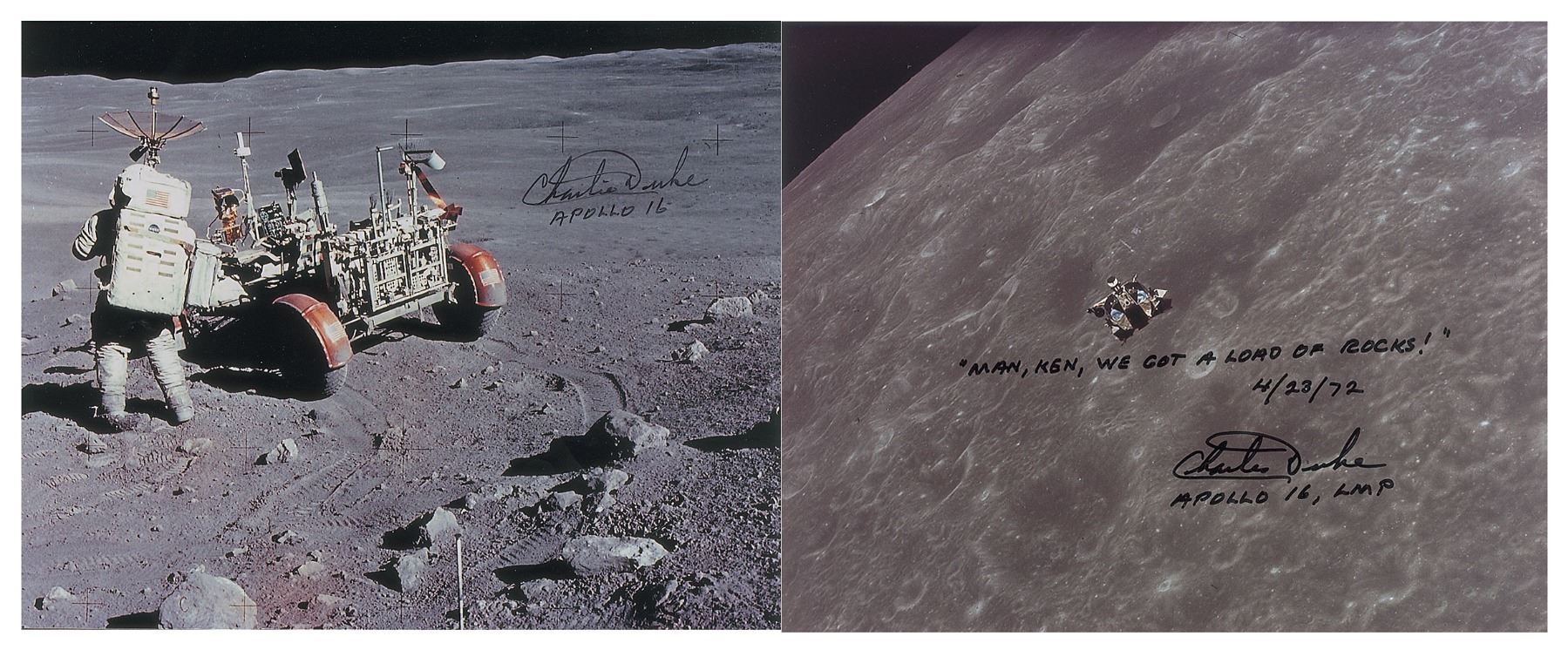Two signed photos: a color satin-finish 10 x 8 photo of LMP Duke standing next to the lunar rover during an Apollo 16 EVA, signed in black felt tip, "Charlie Duke, Apollo 16"; and a color semi-glossy 10 x 8 photo of the LM Orion soaring high above the lunar surface during the Apollo 16 mission, signed in black felt tip, "'Man, Ken, we got a load of rocks!' 4/23/72, Charlie Duke, Apollo 16, LMP." In overall fine condition.