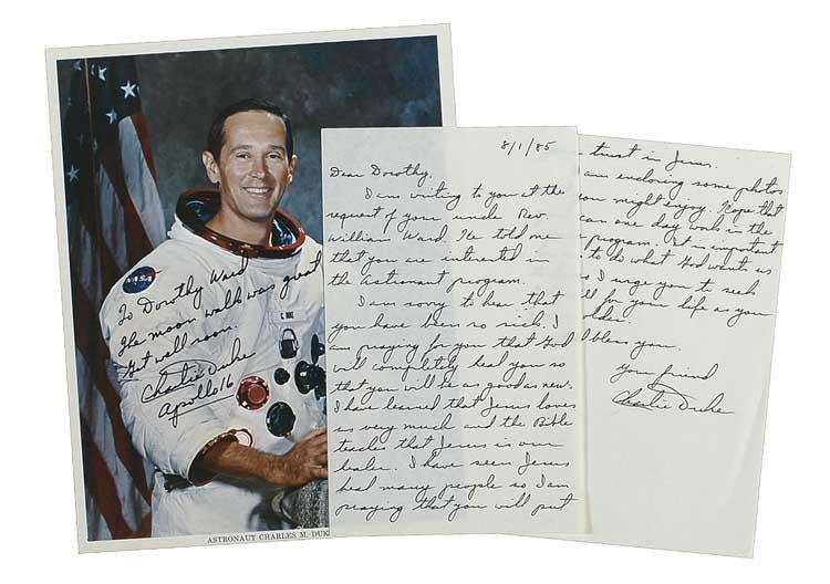 ALS, two pages, 5 x 8, dated August 1, 1985. Duke writes to a young girl at the behest of her uncle. In part: “He told me that you are interested in the space program. I am sorry to hear that you have been so sick…I am enclosing some photos that you might enjoy. Hope that you can one day work in the space program.”; and a color 8 x 10 NASA photo of Duke in his space suit, signed and inscribed to the letter’s recipient, “To Dorothy Ward, The moon walk was great. Get well soon. Charlie Duke, Apollo 16.” In fine condition. Pre-certified Scott Cornish and RRAuction COA.