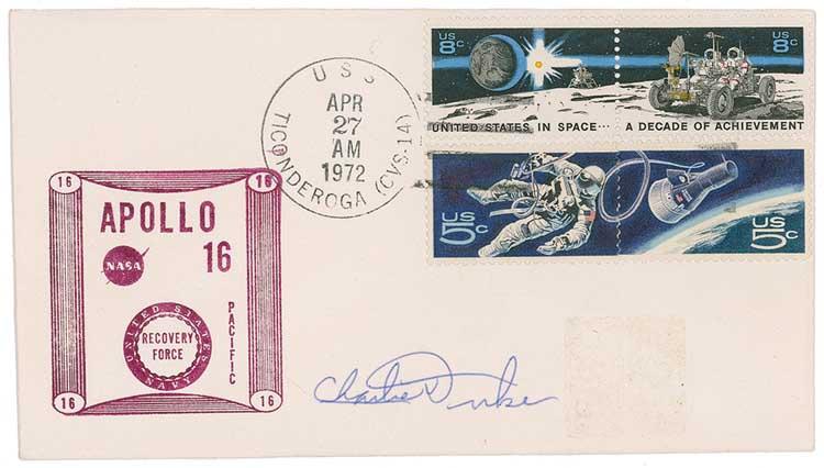 Apollo 16 recovery postal cover with a cachet honoring the Apollo 16 recovery force, signed on the front in blue ink by Duke. In fine condition, with light block of toning next to signature from an old label. Pre-certified Scott Cornish and RRAuction COA.