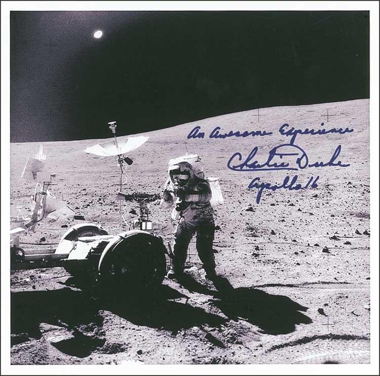Laserprint 8.5 x 8.5 photo of Duke on the lunar surface, signed in blue felt tip, “An Awesome Experience, Charlie Duke, Apollo 16.” In fine condition. Pre-certified Scott Cornish and RRAuction COA.