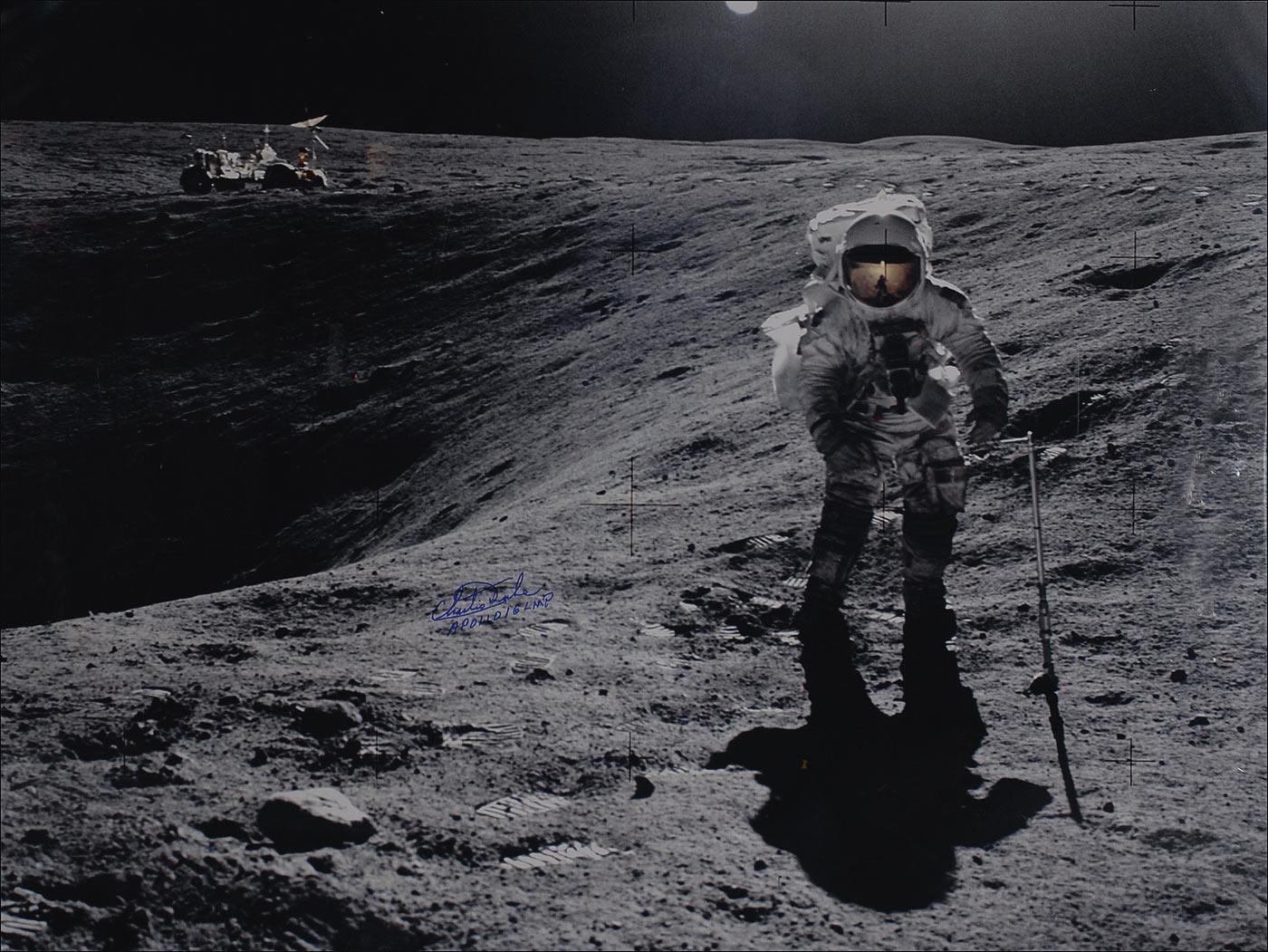 Visually striking huge color glossy 40 x 30 photo of Duke on the surface of the moon, signed in blue felt tip, “Charlie Duke, Apollo 16 LMP.” In fine condition, with scattered light edge dings and creases.