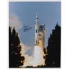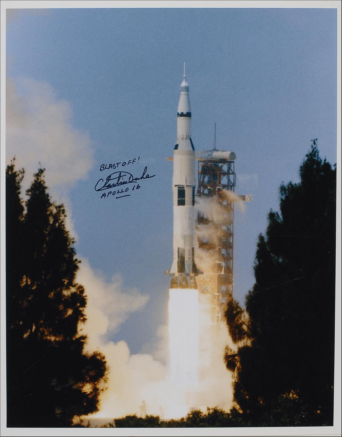 Exhilarating color satin-finish 16 x 20 photo, signed in black felt tip, “Blast off! Charlie Duke, Apollo 16.” In fine condition, with a few scattered trivial surface impressions. Item is aligned to the renowned exhibition ‘Images of Apollo’ running at the Kansas Cosmosphere.