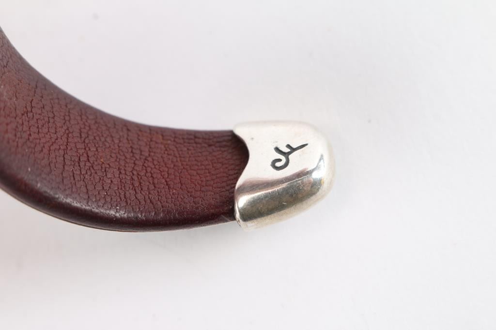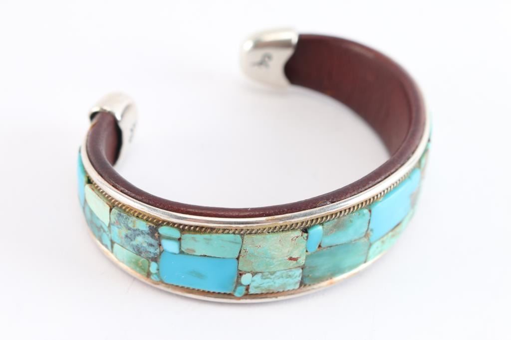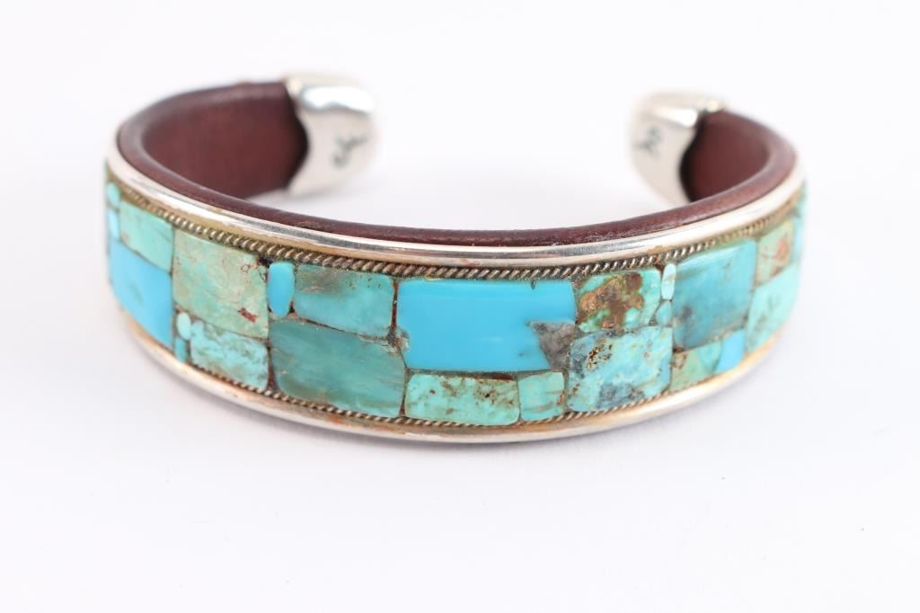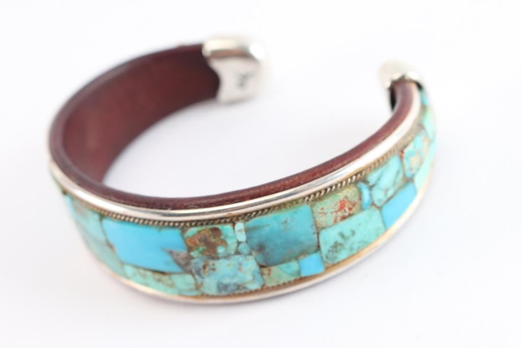 Leather lined sterling cuff inlaid with natural cut turquoise, accented with petite rope design. Measures 9 1/2".